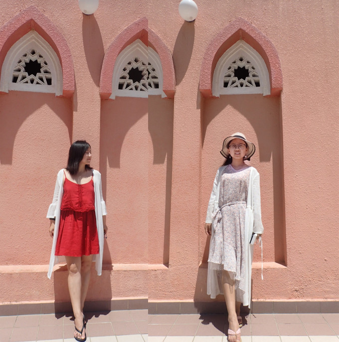 ▲「沙巴大学」——陪我在烈日下的粉墙打卡装13,即便她并不想晒黑(虽然她可能早已放弃挣〔fang〕扎〔shai〕了)