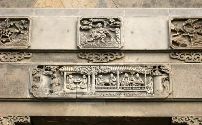 门楣上的砖雕虽经沧桑岁月,仍保存完好,砖雕上的人物神态各异,栩栩如生。有高力士脱靴、杨国忠磨墨,唐僧师徒西天取经等典故。可见屋主是一崇尚传统文化的儒商哦。