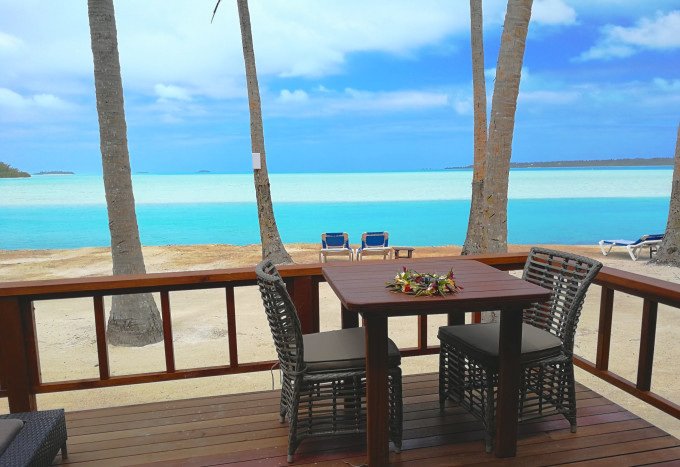我们在Aitutaki订到的是海边小木屋(Beach Front Bungalow),一出阳台就是闪闪发亮的碧海蓝天。