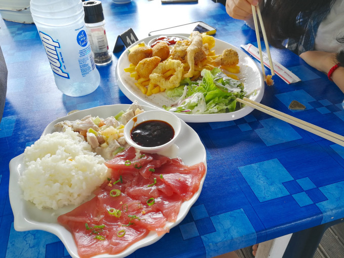 集市上怎么少得了小吃,前面这道是生鱼片和 Ika Mata,一种以生鱼和蔬果切丁,加入椰浆拌成的爽口沙拉,可谓是本地的头牌名菜了。