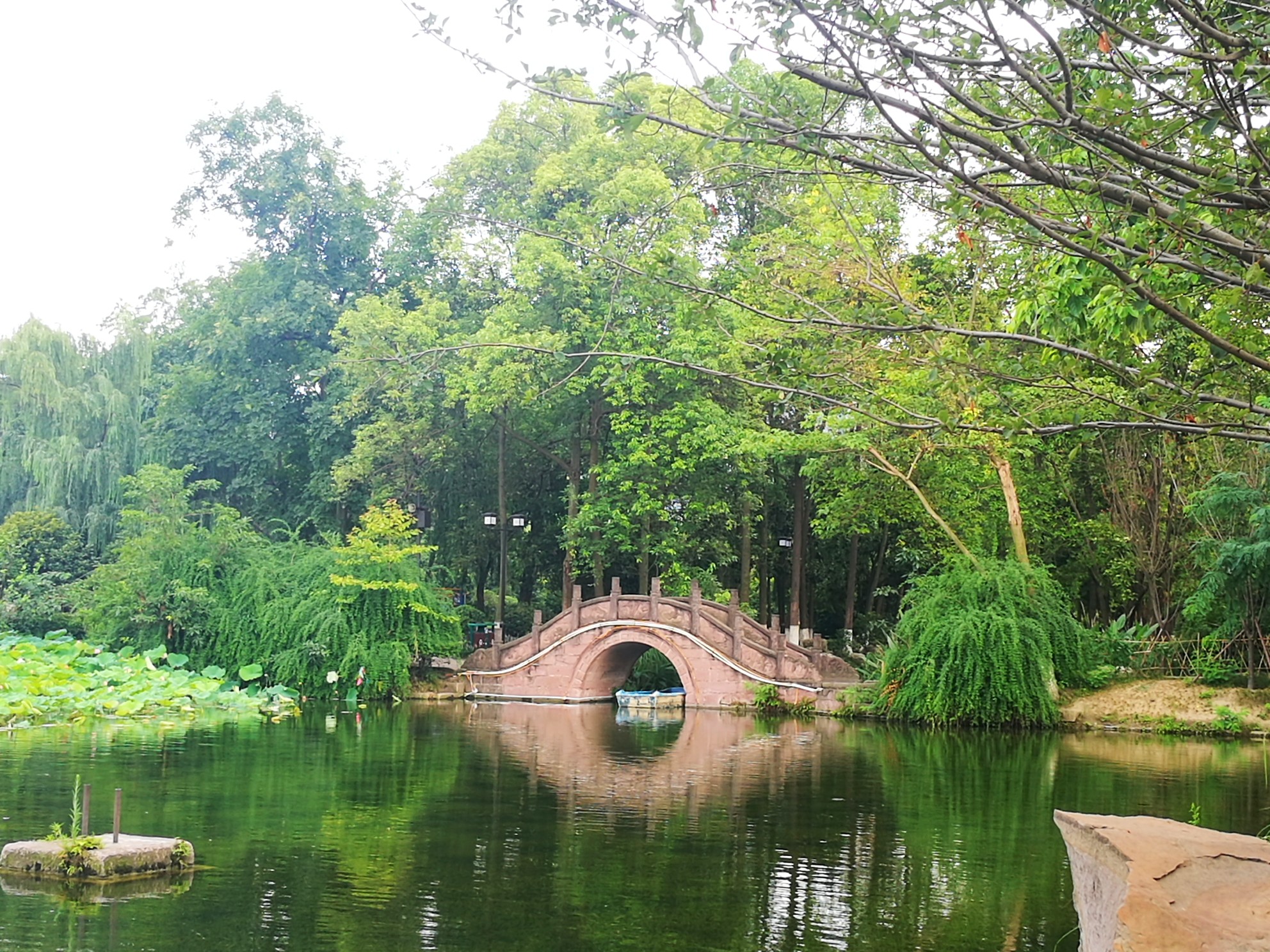 “画舫远汀迷柳树,一池明月浸荷花”也许就是对桂湖公园最好的描述。进入古色古香的公园入口,满眼望去,茂林修竹,一片浓郁而苍翠的绿色,偶有零星小花点缀其间,为其增添一份缤纷的灵动。