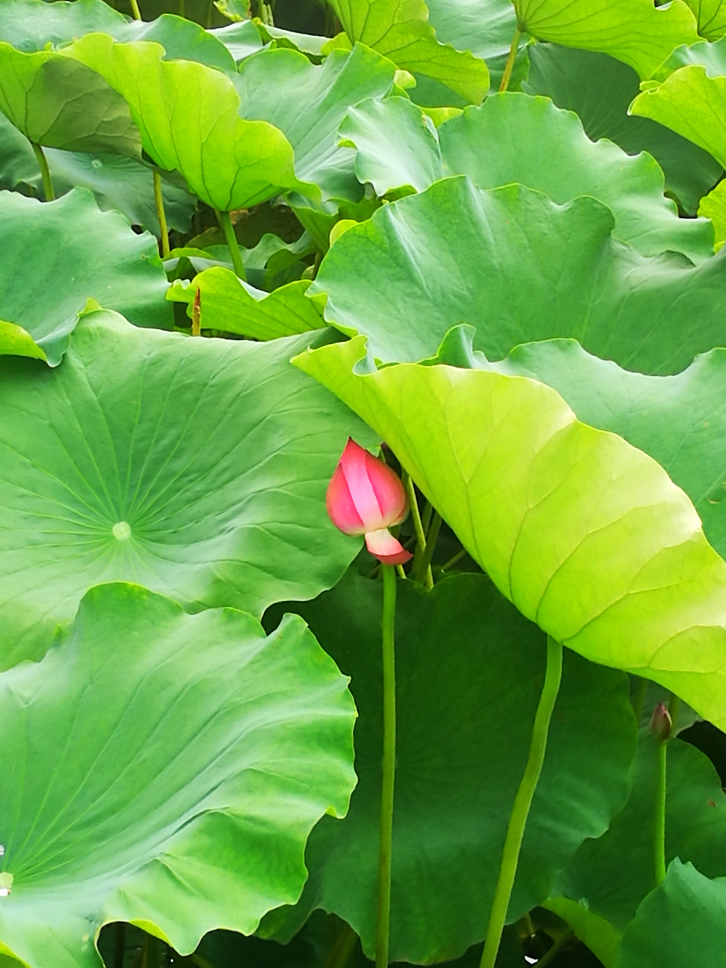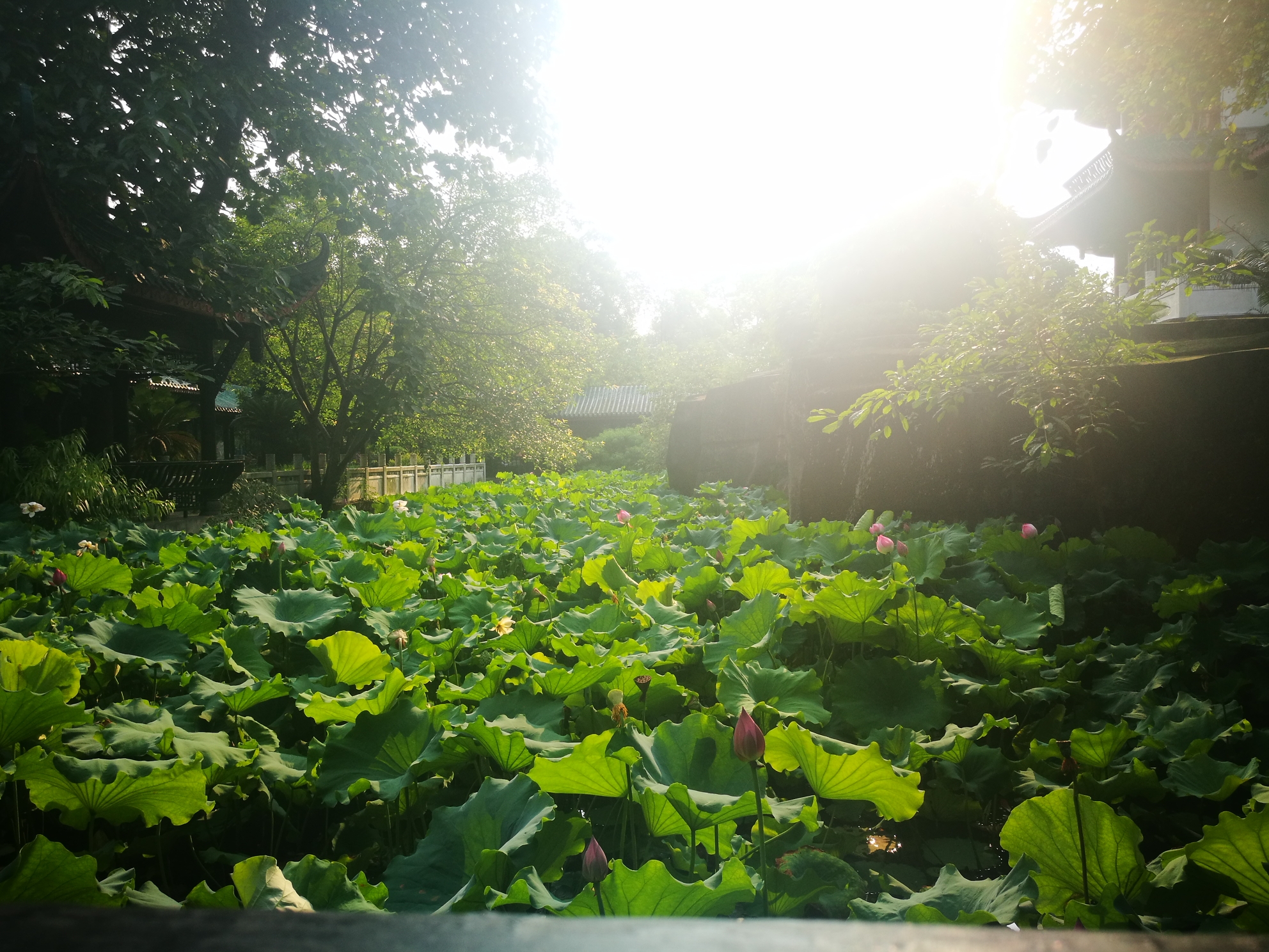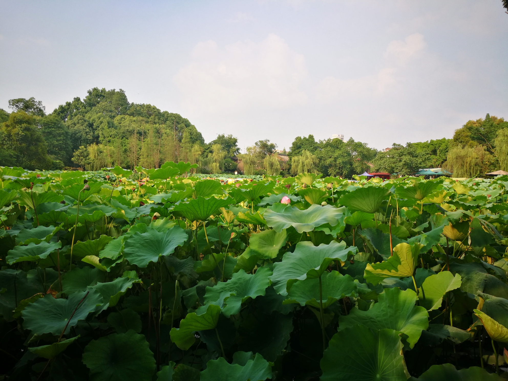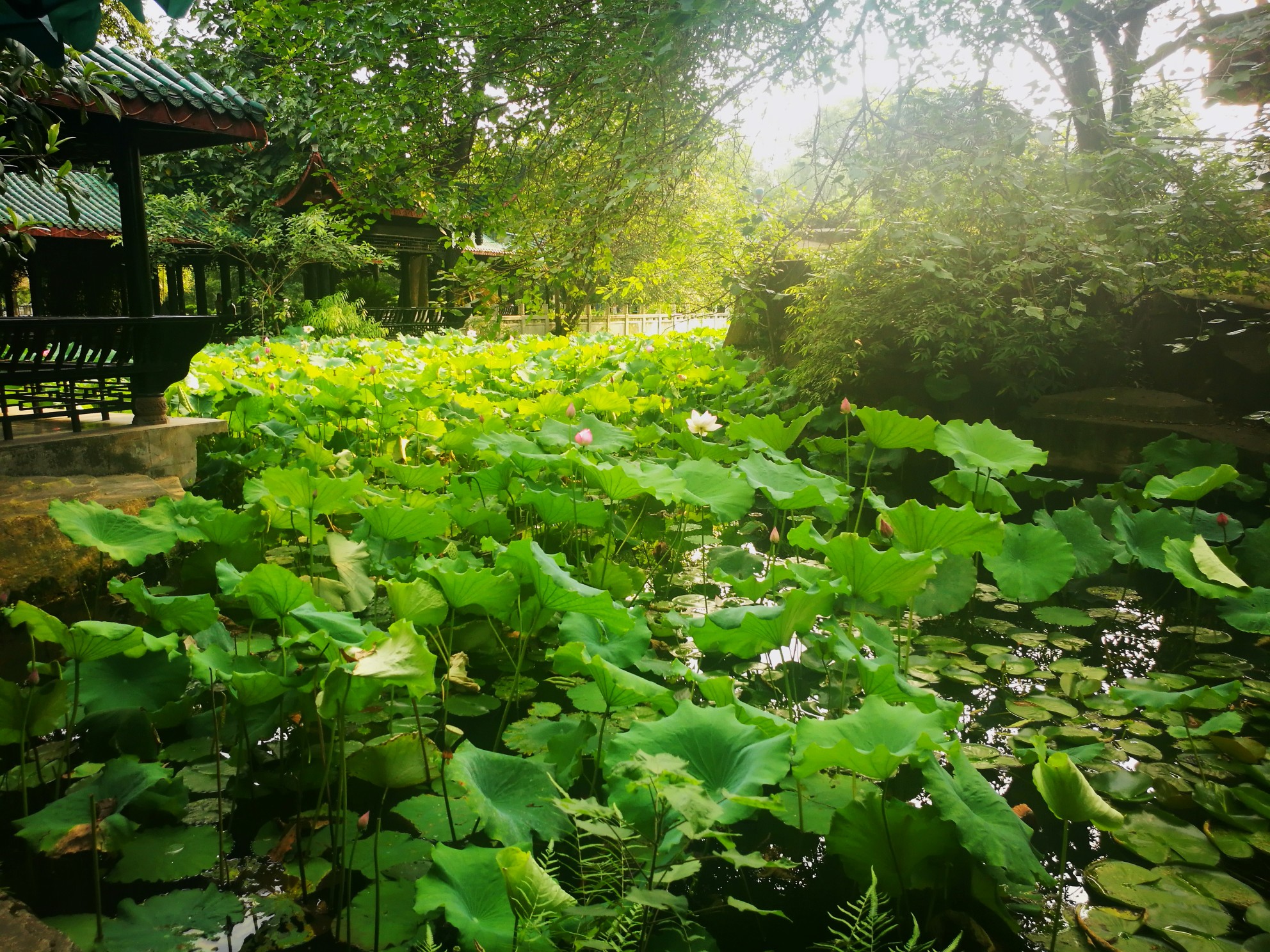 时值七月,也是古代的六月,想起那句很著名的诗:“毕竟西湖六月中,风光不与四时同。接天莲叶无穷碧,映日荷花别样红。”此时的桂湖,正是应了诗中的景:凌波仙子乘风起舞,虽以崭露姿色,但毕竟还是娇羞的少女,低着头以硕大宽阔荷叶为庇护,躲躲藏藏。