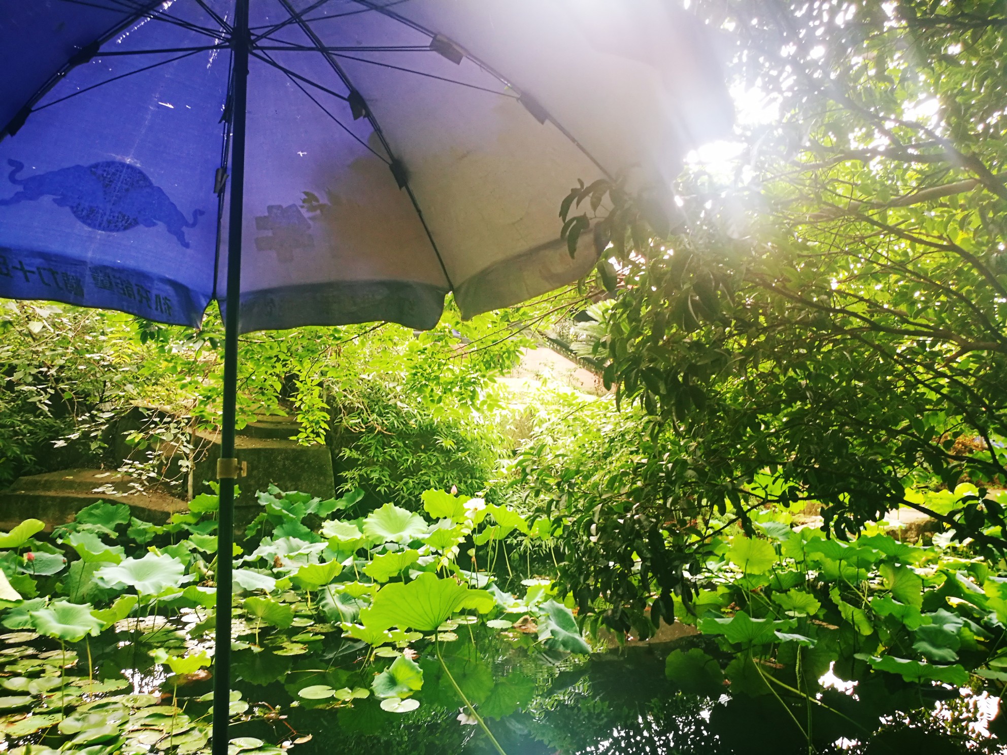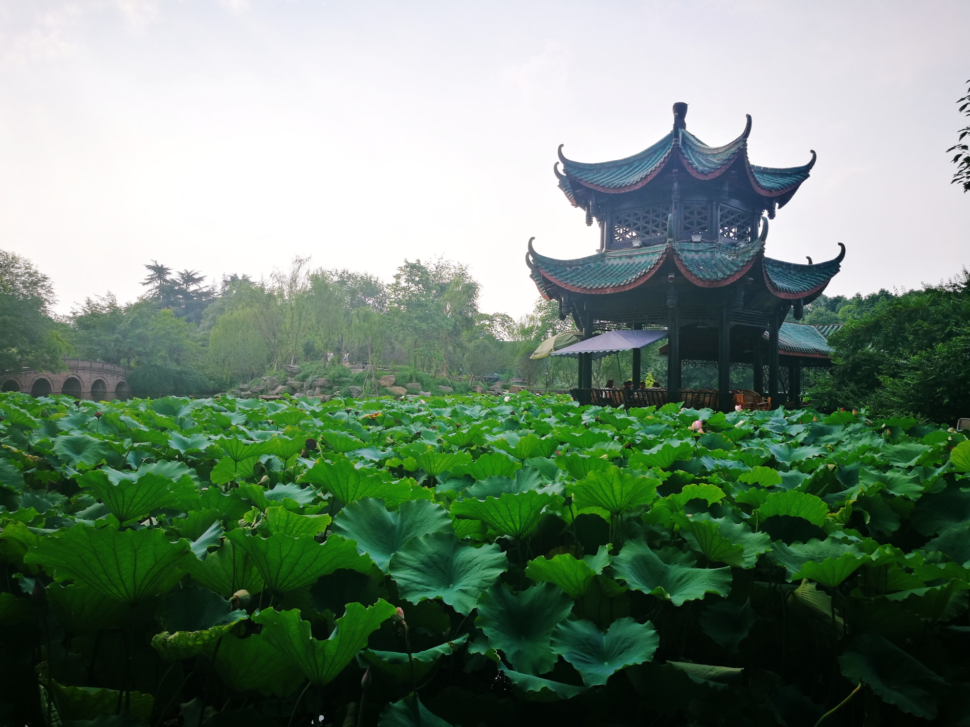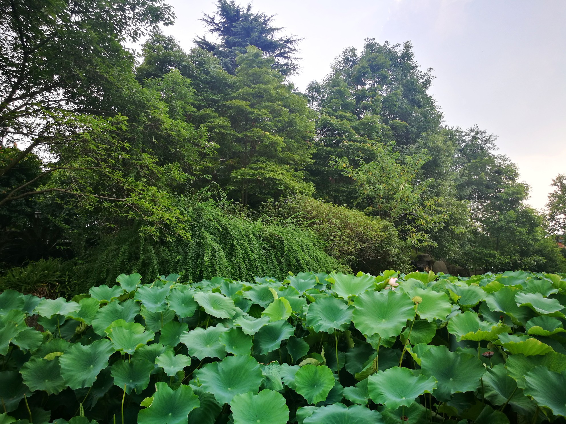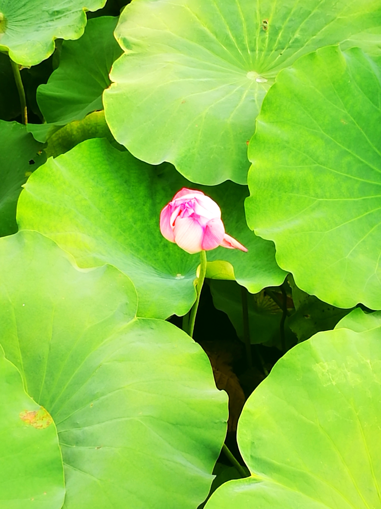 时值七月,也是古代的六月,想起那句很著名的诗:“毕竟西湖六月中,风光不与四时同。接天莲叶无穷碧,映日荷花别样红。”此时的桂湖,正是应了诗中的景:凌波仙子乘风起舞,虽以崭露姿色,但毕竟还是娇羞的少女,低着头以硕大宽阔荷叶为庇护,躲躲藏藏。