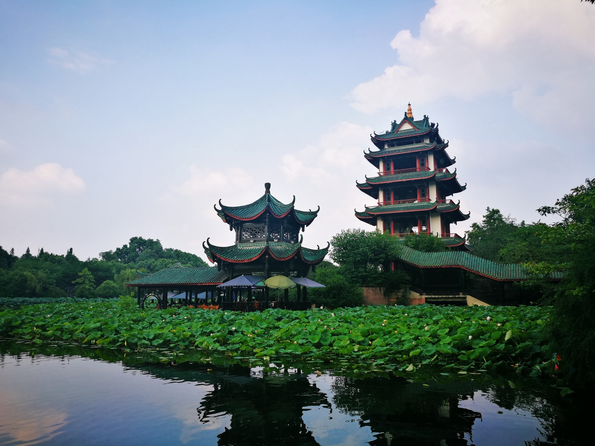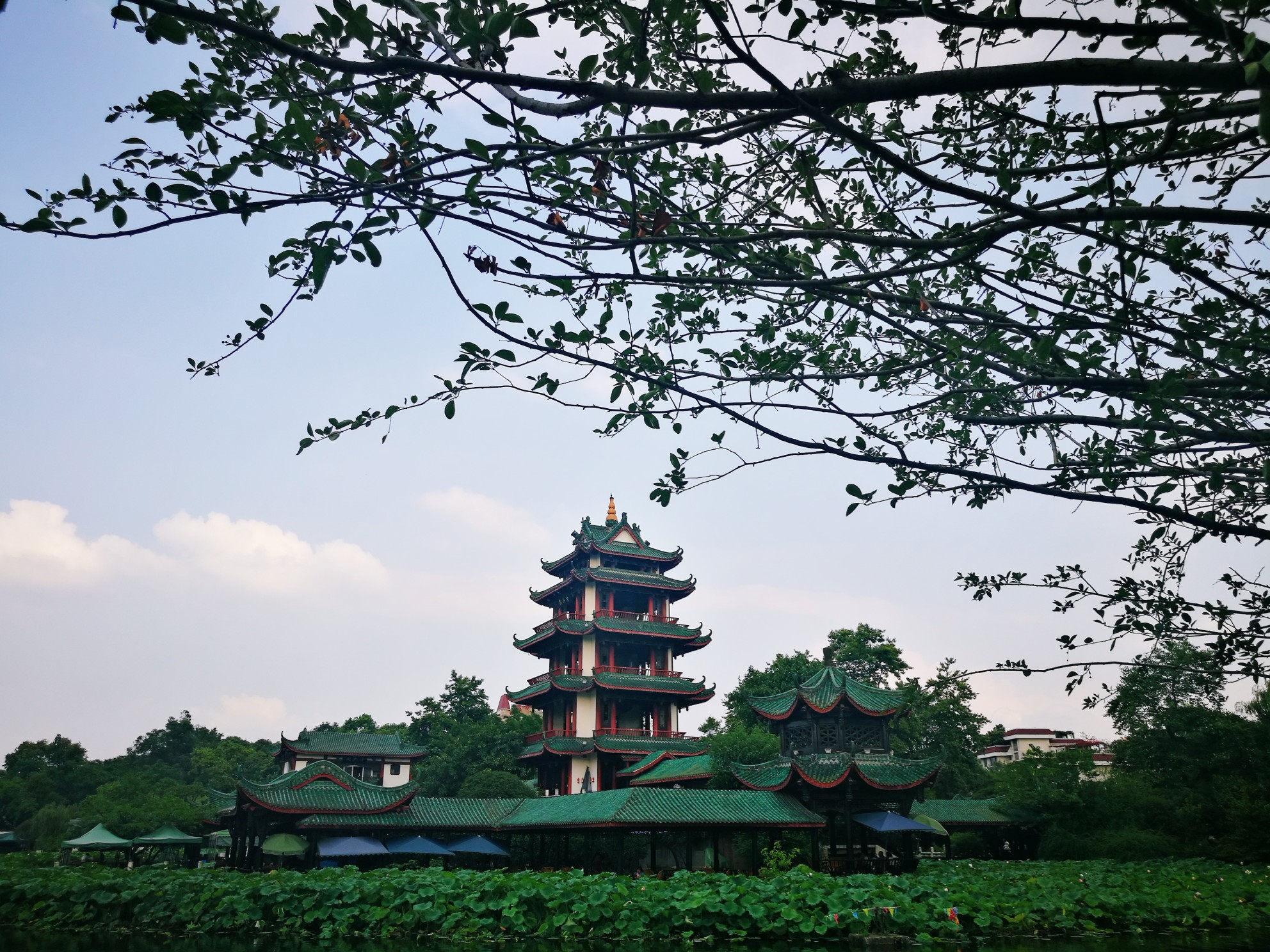 环绕河堤的,是一排排垂柳和依湖而走的长廊。灰绿色的瓦顶与茂密的树木相交融,棕红色与黑色的漆柱也消失在绿海中,唯有画舫雪白的墙体在深色背景中格外突出。在长廊的尽头,耸立着一座别致的小楼,飞檐向上高高翘起,若展翅高飞的仙鹤,格外精美,如果有机会登楼远眺,看看这一片生机盎然的绿色,这一片怡人的碧波,也许又会有别样的心境。