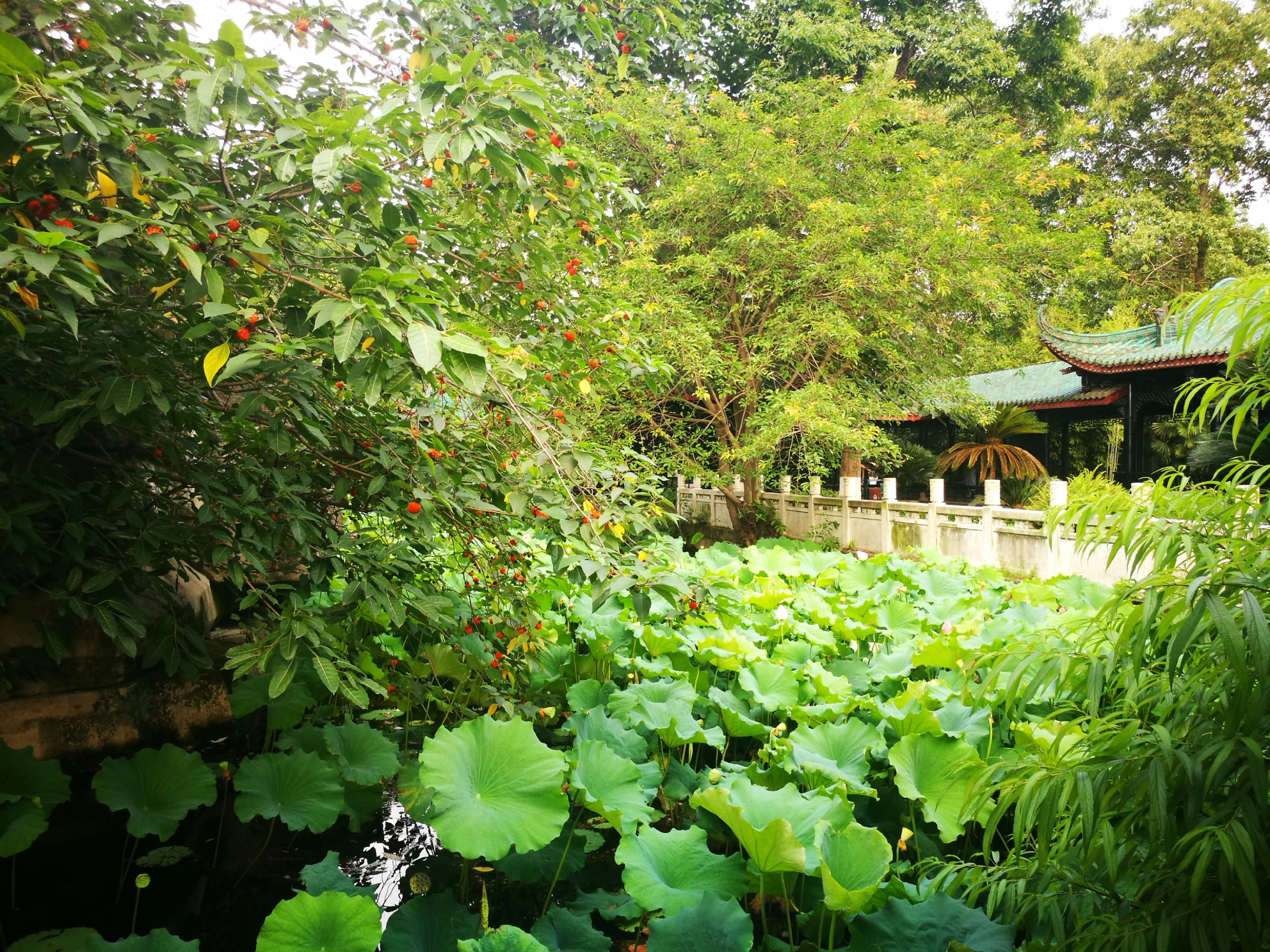 枝头的石榴也已摇摇欲坠,杨梅也在绿叶丛中点点猩红。作为一个北方的孩纸表示第一次见到杨梅树,很想摘一个尝尝,可惜它们长在水边根本够不到~