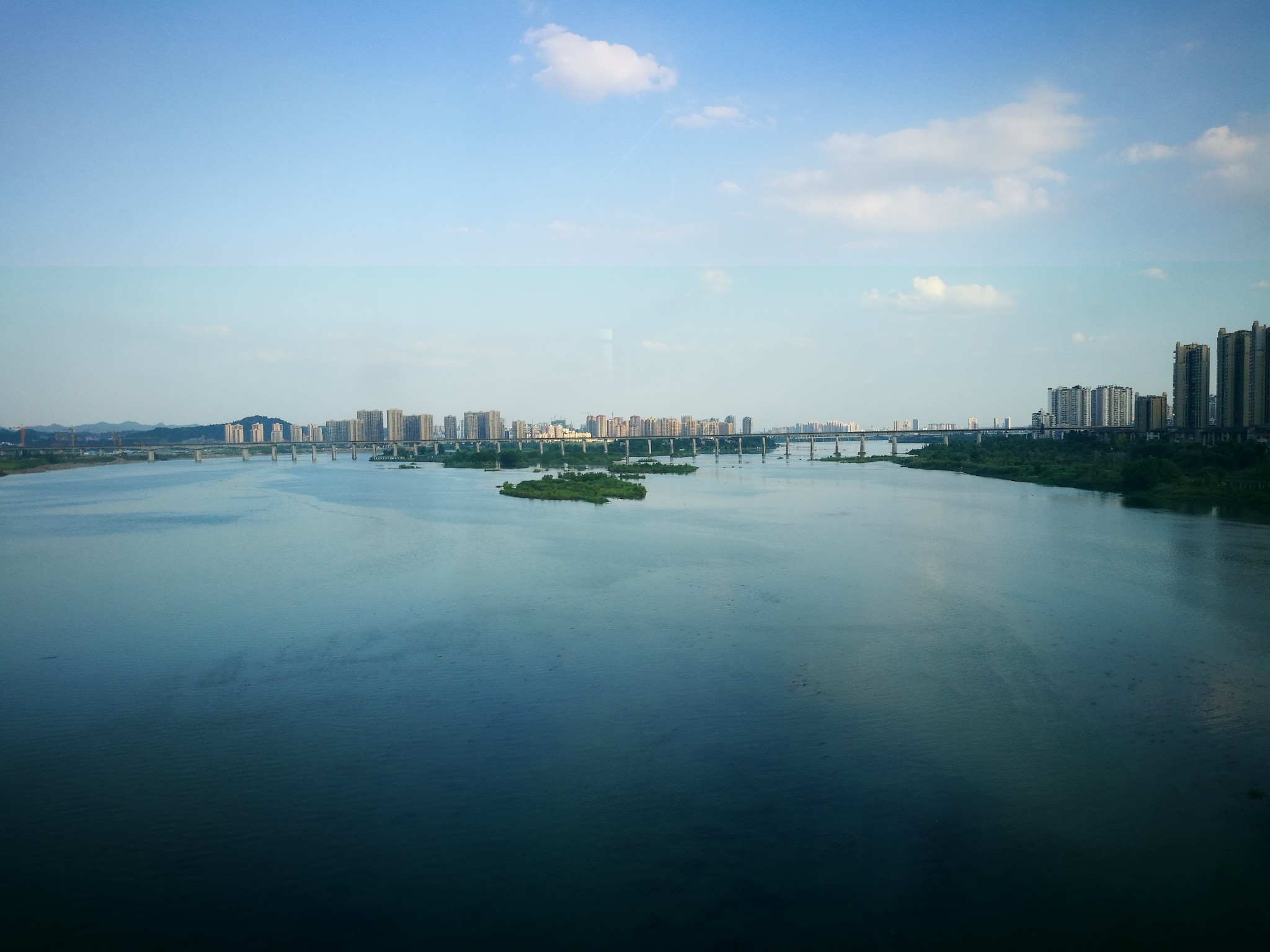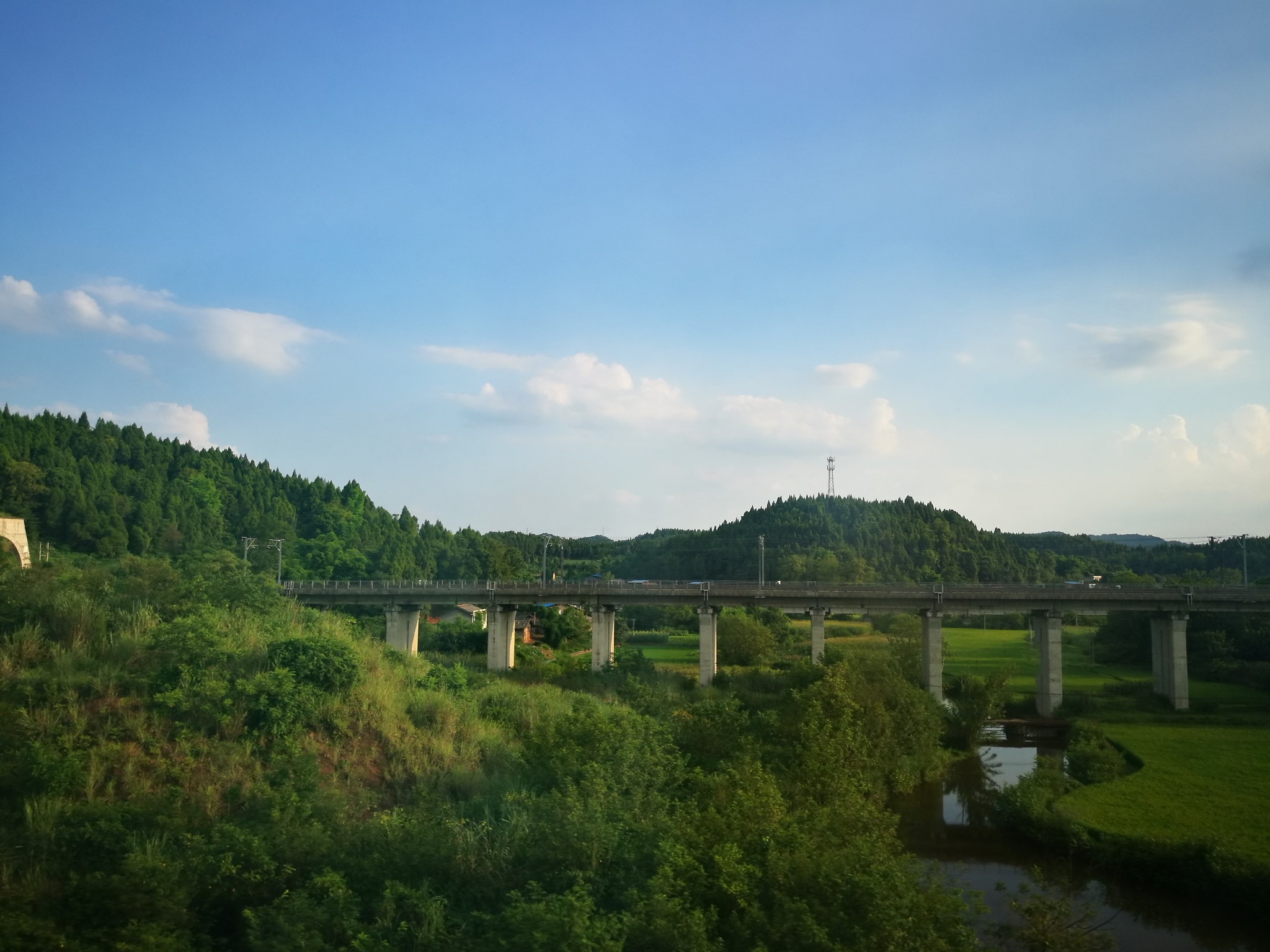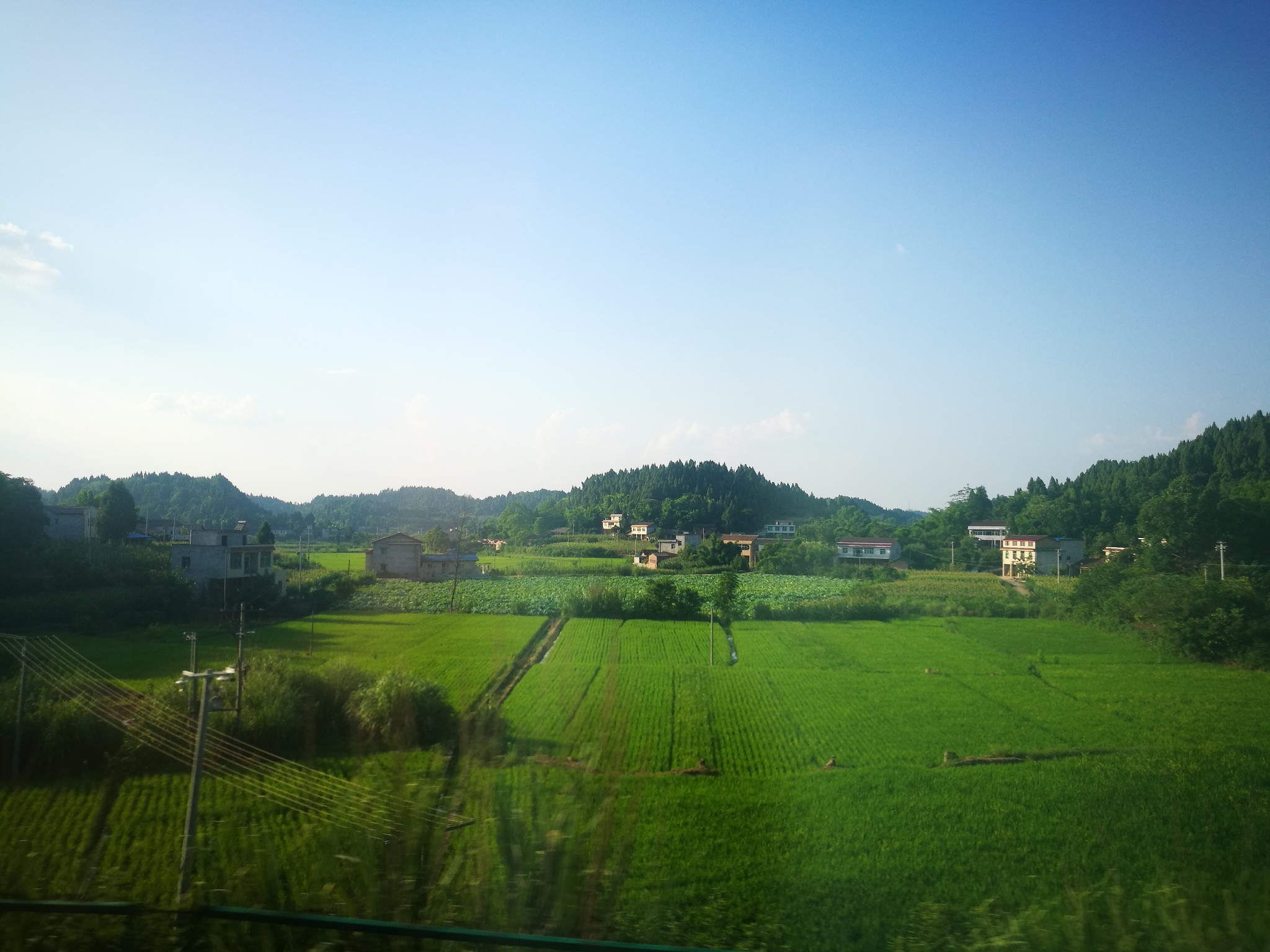 满眼青山绿水,山脚下整整齐齐的荷塘,荷叶笼上一层浓郁。川中虽多山,却不似秦岭那样高大严峻。大多山上开凿出梯田,偶尔有自家盖起的小楼隐在山中,偶尔有隧道中冲出的列车呼啸而过。过隧道的感觉异常刺激,正看着风景,突然眼前一黑,过一会又重见光明,这样经历过的大大小小的隧道估计也有几十个,火车就像一条巨龙在山间飞舞盘旋着,不一会又回到了平原。