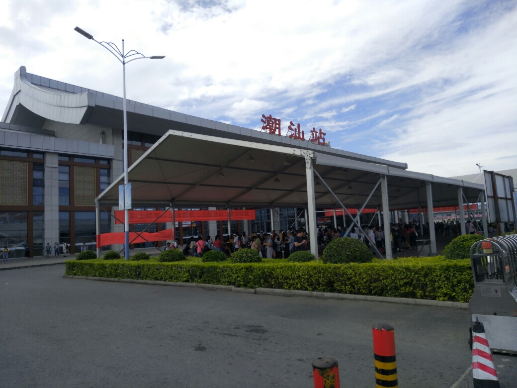 9月12日下午2:20,风驰电掣般的动车缓缓停靠潮汕站。潮汕站位于潮州和汕头中间偏西,属于两市共用的高铁站,站不大,对于经济发达的广东东部沿海地区,似乎不大匹配,特别是每当节假日期间,更是捉襟见肘。出站后右手边有'粤运汽车站'售卖潮汕站到潮州市区的快线巴士K1汽车票,一票价制,票8元/人到市区,沿途停靠点较多。大约50分钟到达市区,我们在南桥市场下车,下车后回走40米到达我们在马蜂窝订好的酒店:金龙大酒店。