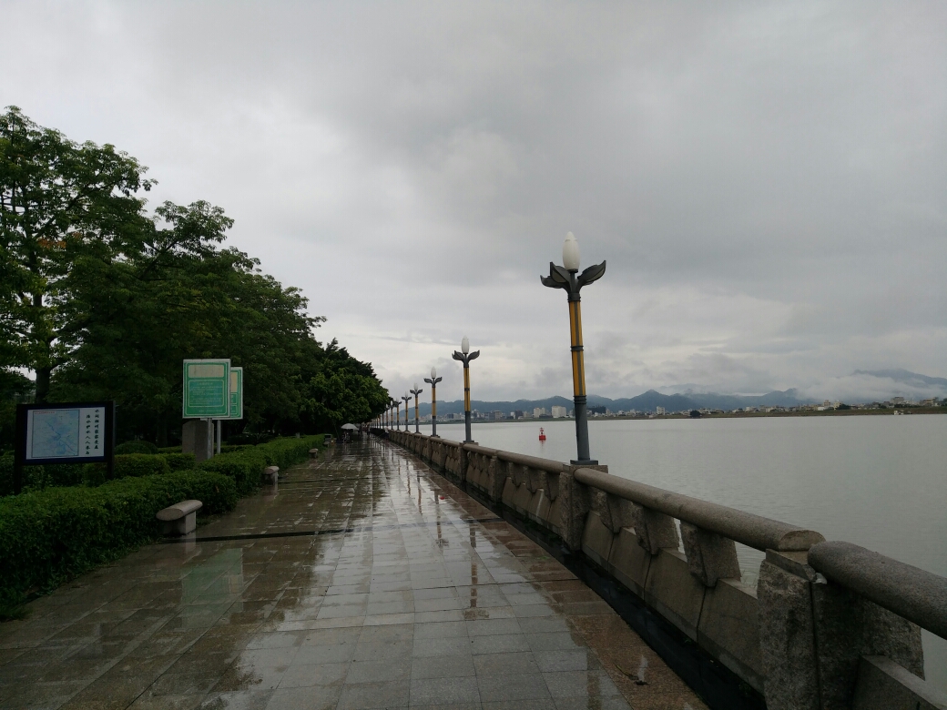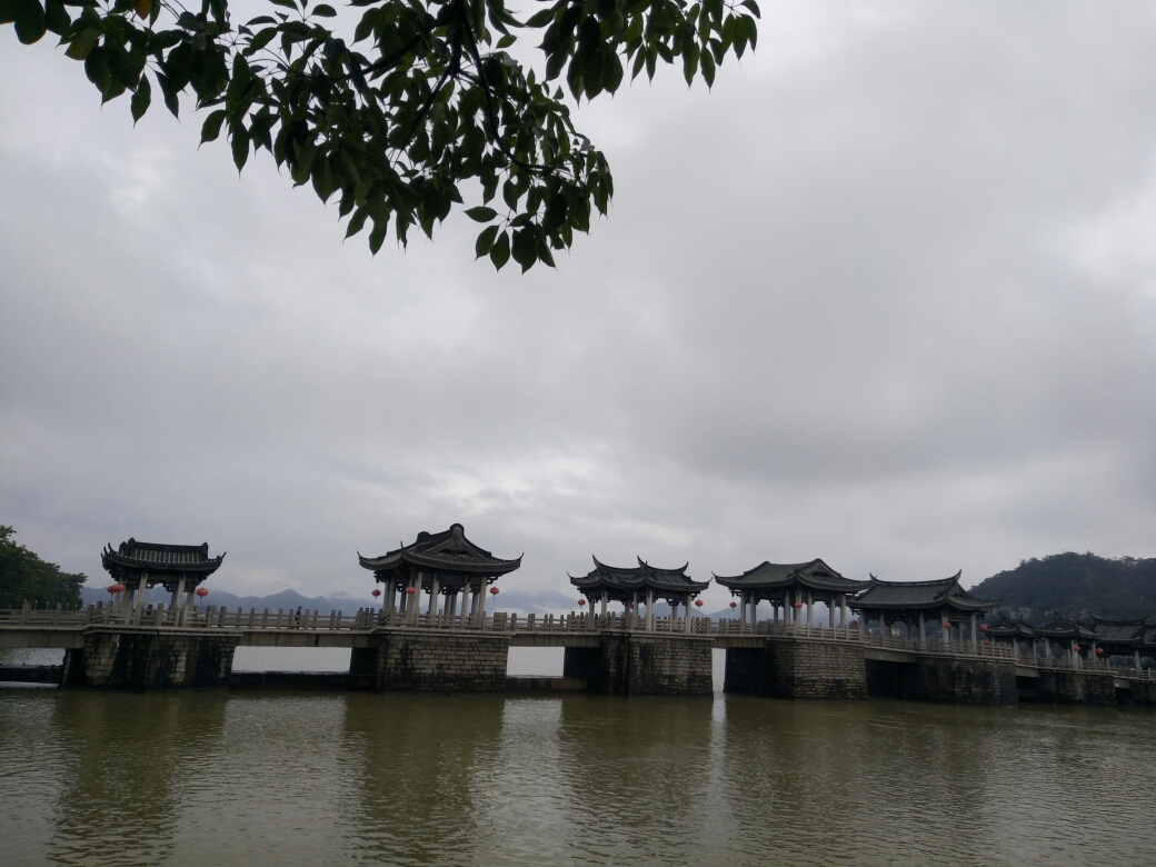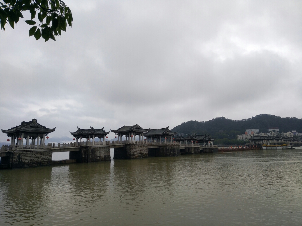 吃完小食,阵雨也变着毛毛零星小雨,继续走几分钟见老式百货大楼后右拐进入东门街,沿东门街50米就是潮州古城著名的广济楼,穿过广济楼就到韩江西岸的滨江长廊。由于已接近下午5点,广济桥只出不进,我们沿滨江长廊漫步。远瞧广济桥,其状如龙,飞架韩江两岸,几千年来承受风雨日晒,默默守护着潮州古城。韩江水域宽广,微波荡漾,远处已是灯火阑珊,在蒙蒙细雨中的剪影静谧而庄严。