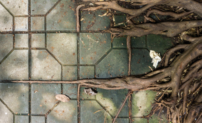 路中的树根沿着砖缝排列成了整齐的形状。