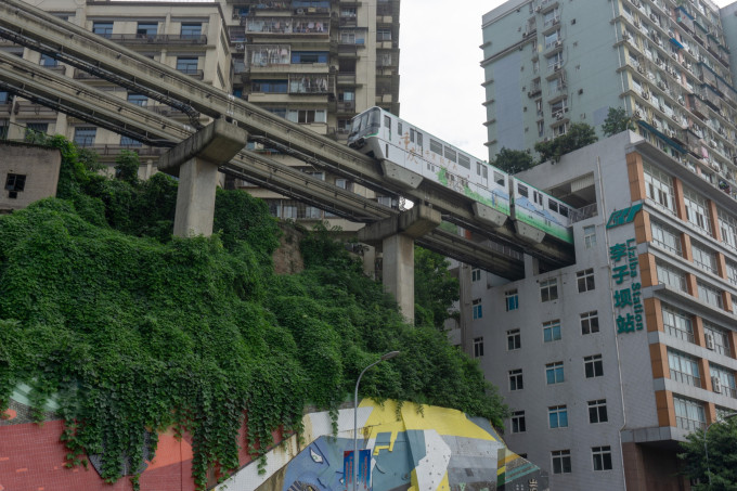 出了步道转身去李子坝地铁站看从楼中穿过的轻轨。