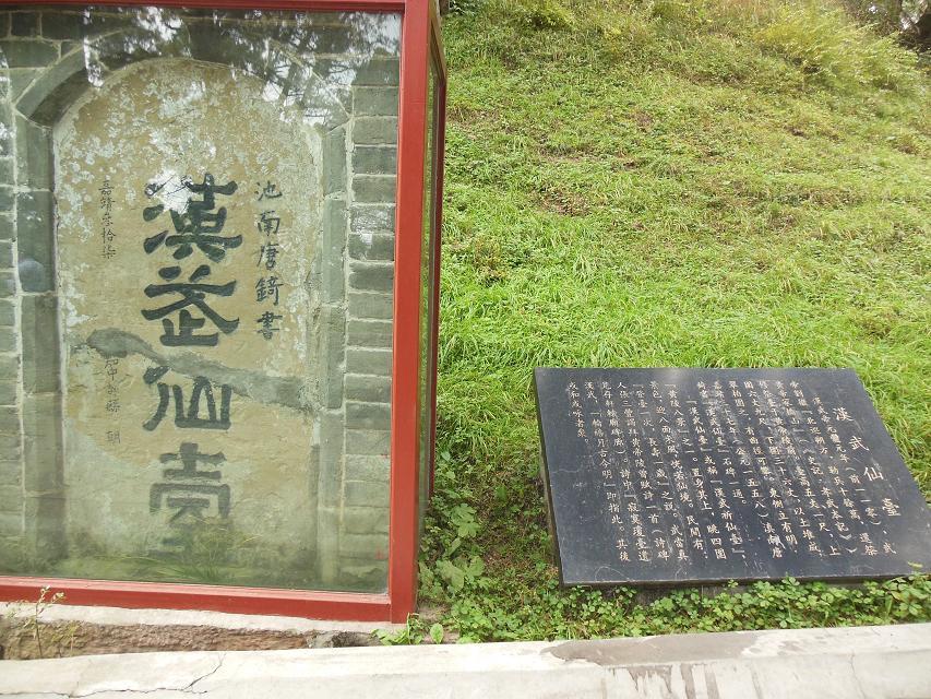 从山下到天园地方殿只有330个台阶左右,那来400个台阶?原来这里“汉武仙台”还有72个台阶也要算上去才对。石碑上写着(大意):公元前110年汉武帝御驾亲征匈奴,将要经过此地祭典黄帝陵,祈求上苍保佑出师顺利,当地的地方官(某某)特地为此建造了这座专供皇帝祈仙的台。