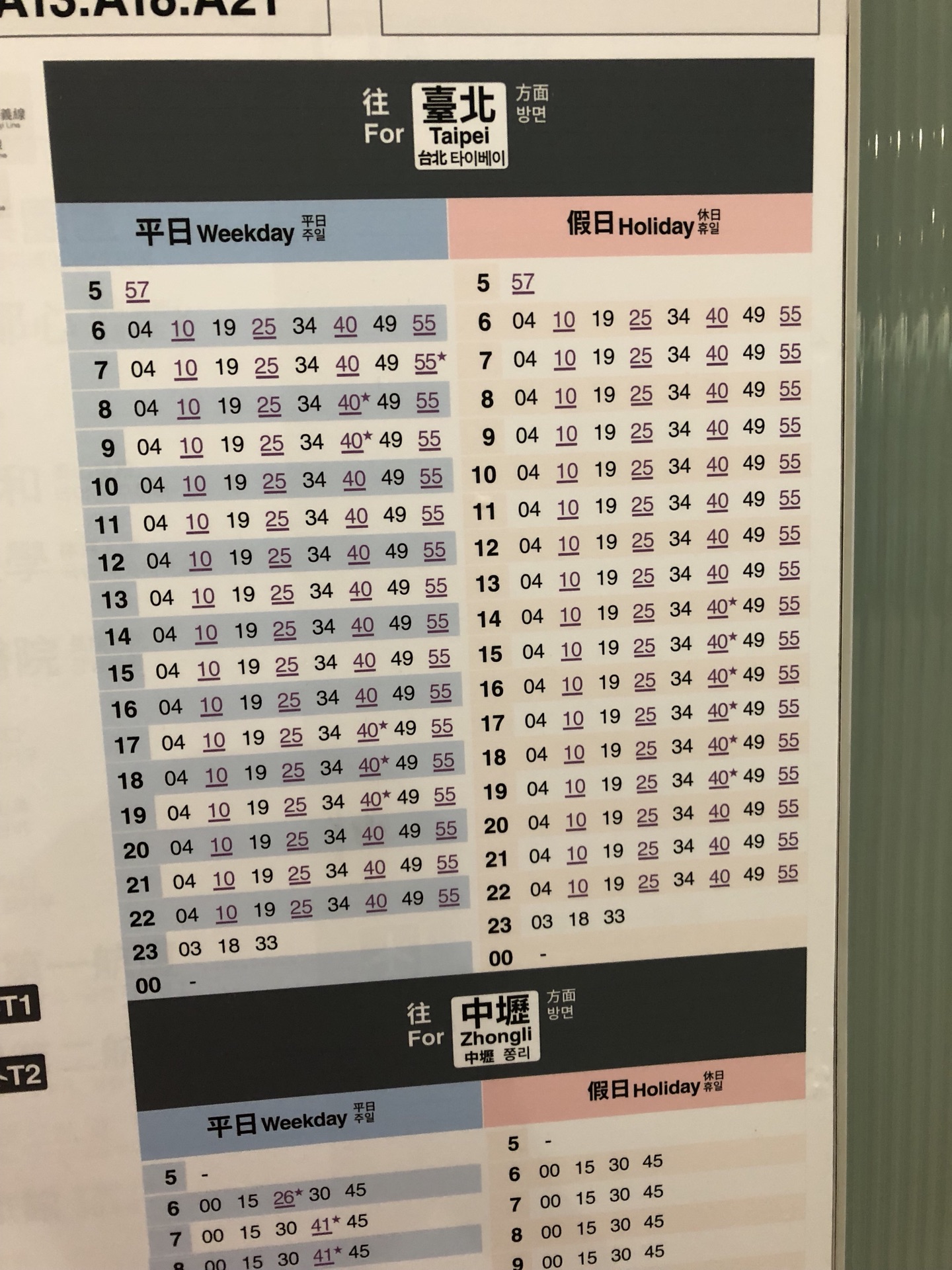 桃园机场到台北车站的捷运在楼下,旅客问询处对面就有电梯。一共有两种捷运,一种是快线,大概只停靠5站还是6站,另一种是每站都停。下图是时刻表,紫色划线的是机场快线的时间。
