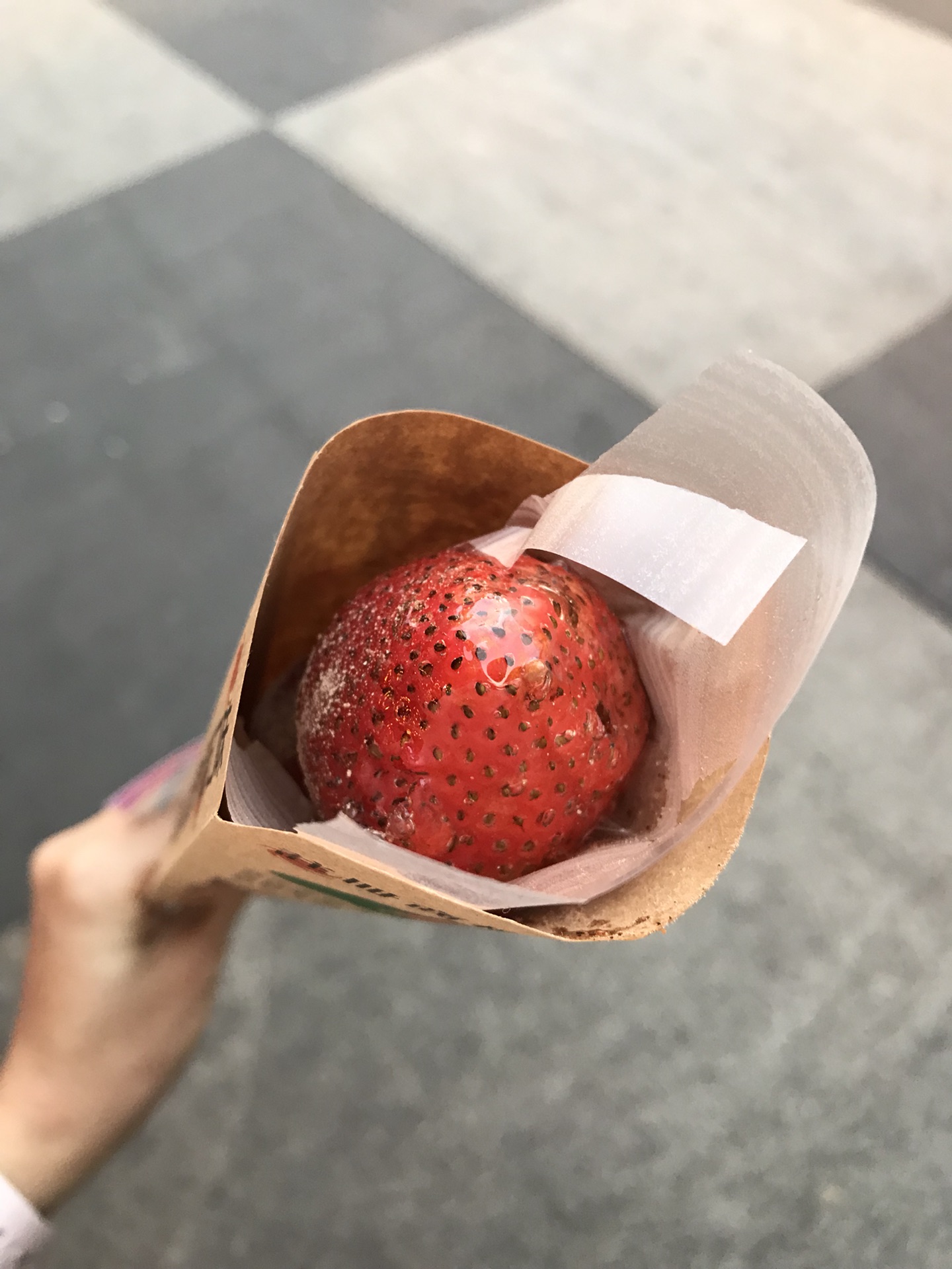 牛B糖葫芦-我们到的时候老板还在裹糖,在等待的期间老板提醒说可以扫支付宝领红包。全草莓糖葫芦一支100台币,番茄乌梅一支60台币(有点想不起来了),用了支付宝花呗支付后,最后支付折合台币大概是42台币。草莓和乌梅都很新鲜。我第一次吃的可以选口味的糖葫芦,吃起来很特别。用来装糖葫芦的纸袋子很方便食用,可以把糖葫芦一颗一颗推上来,不会弄得手粘粘。