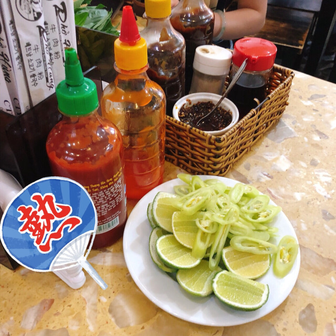 中午来到都是满座的,每人面前都是一大碗河粉和一大盘香料菜(一开始很懵地把这些菜当作菜来吃...)青柠加进去,河粉会更开胃,清爽的感觉,还有各种酱料用勺子沾着河粉吃,不会觉得这么清淡。