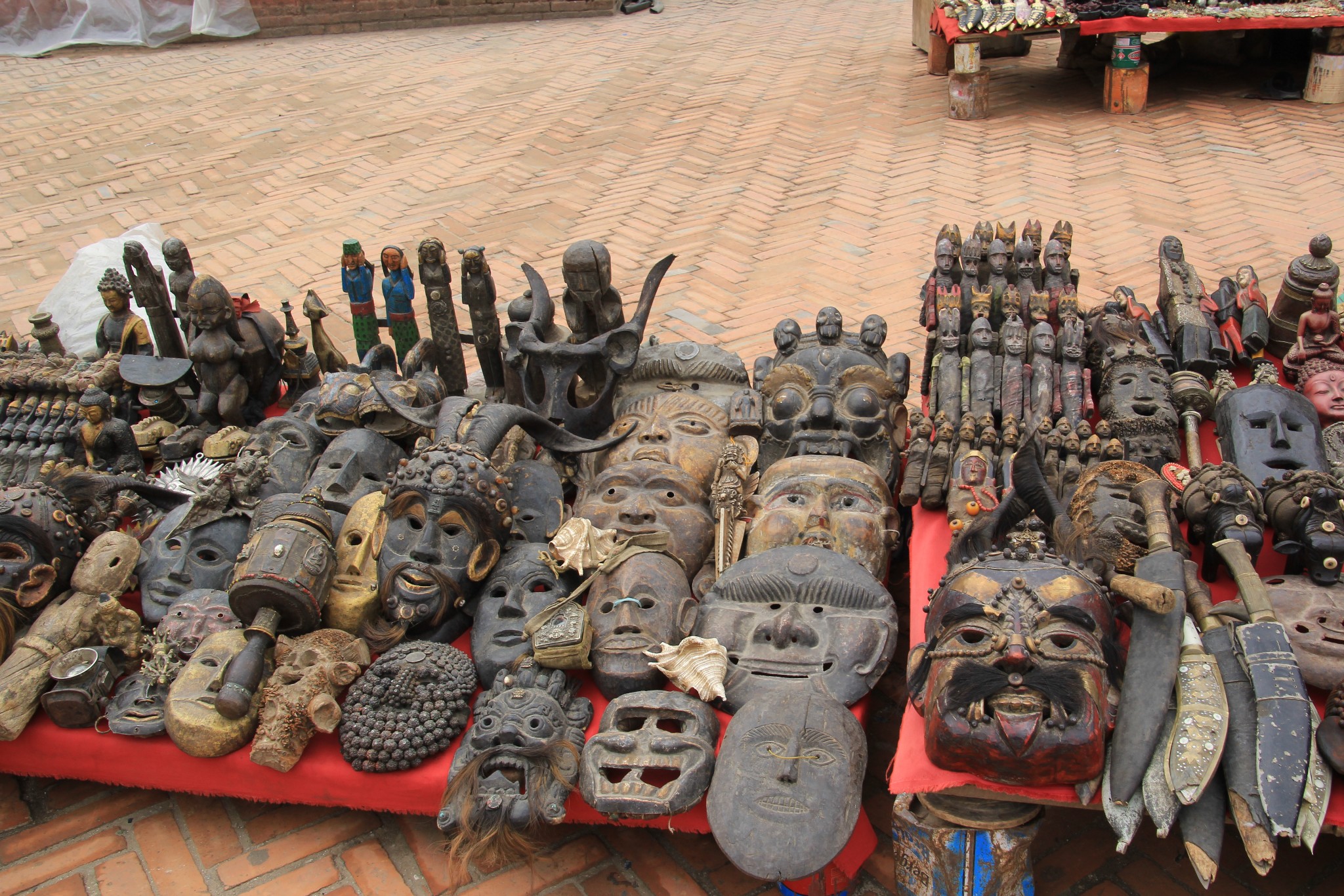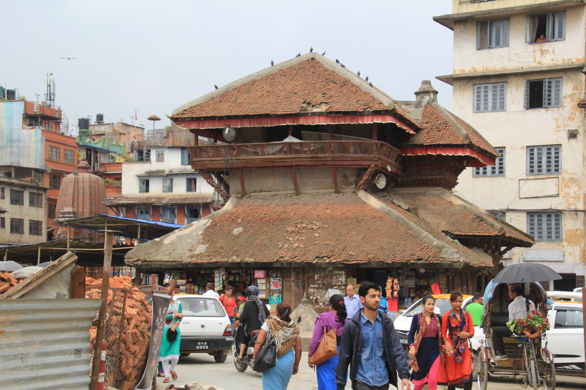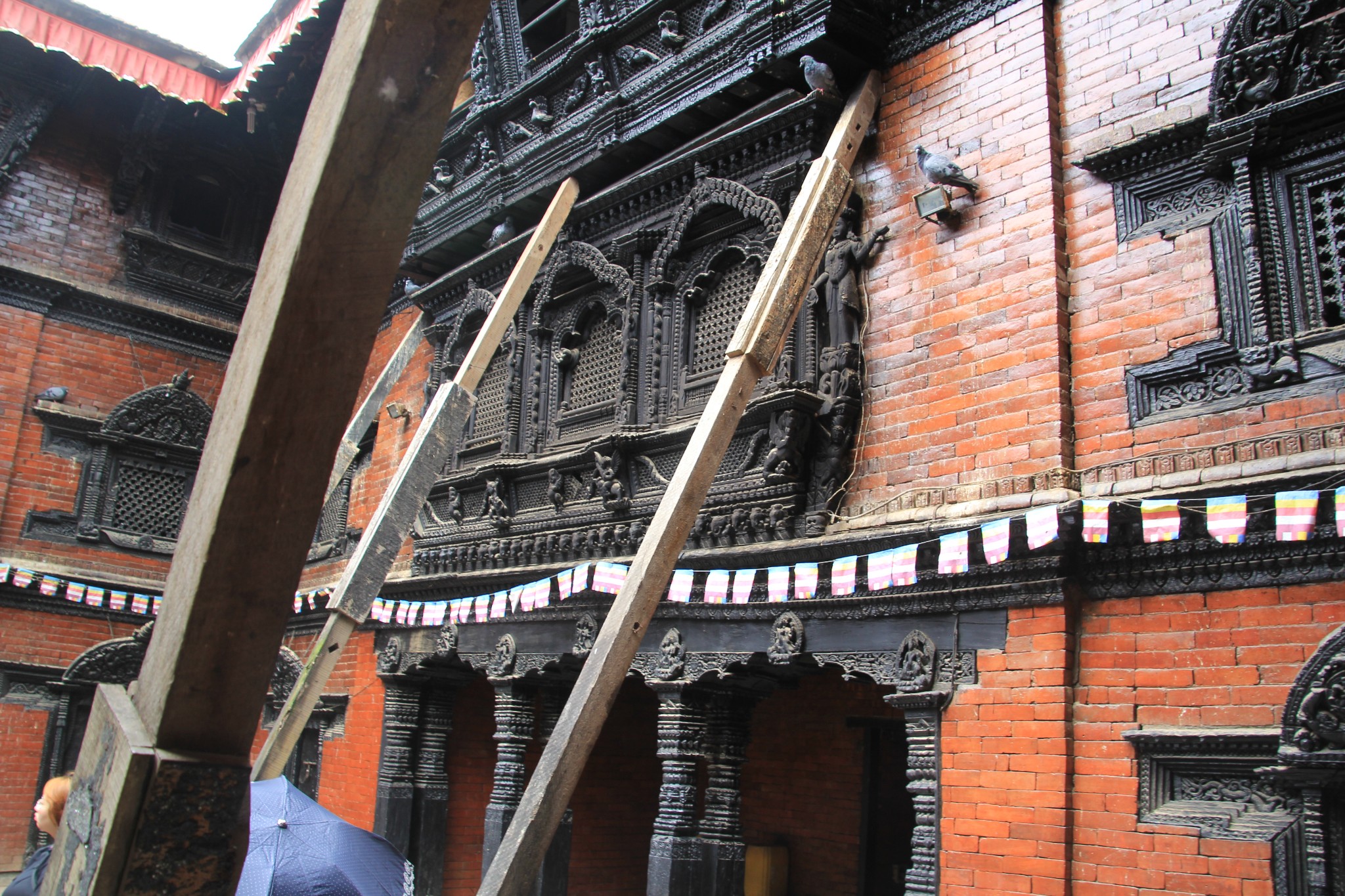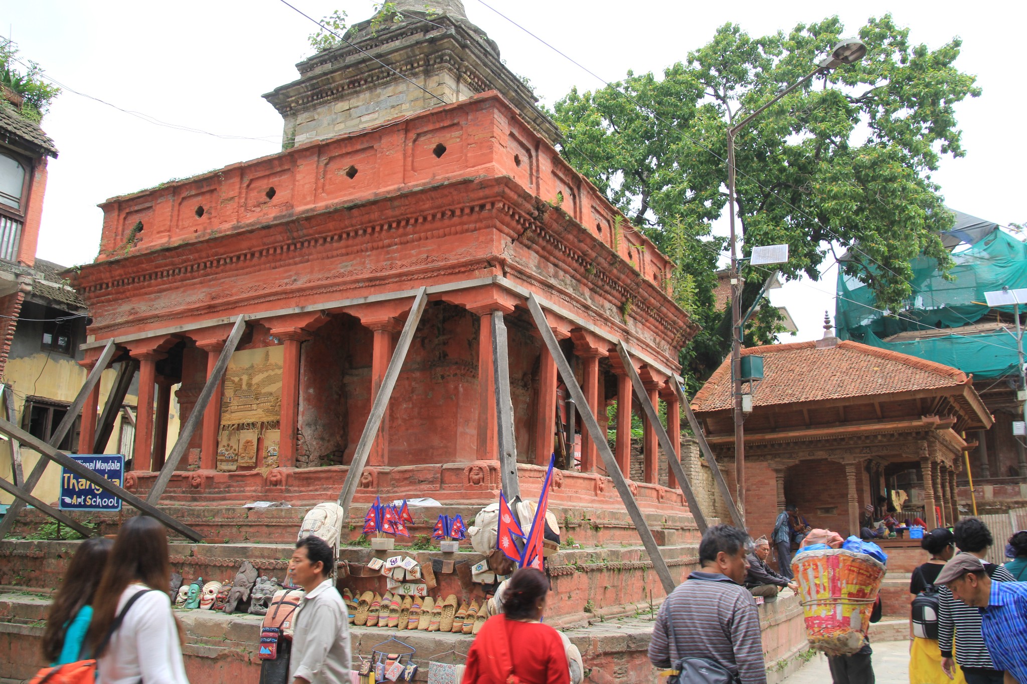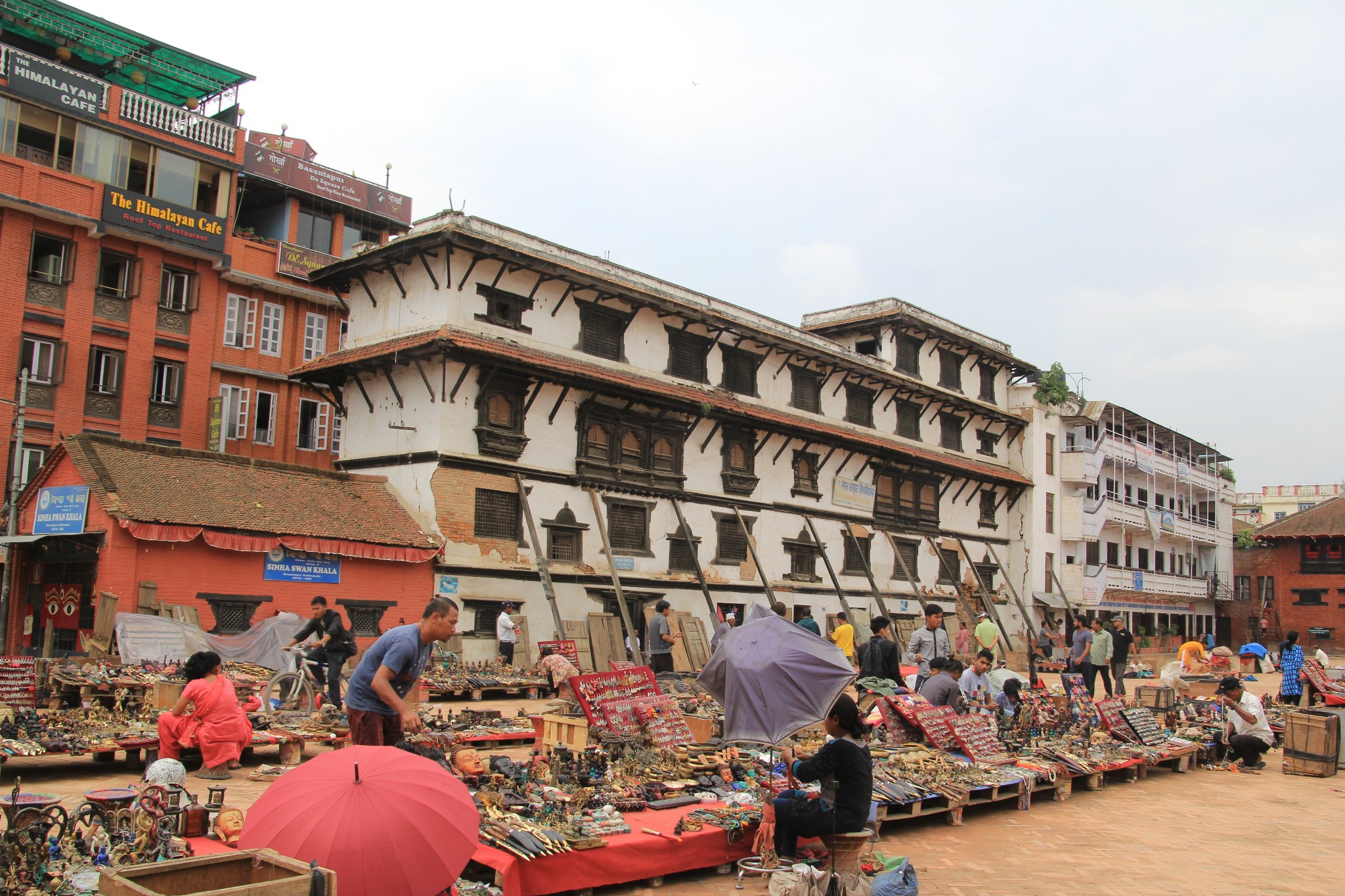 杜巴广场卖尼泊尔手工艺品的摊档。受地震影响的建筑物仍用木棒支撑着。