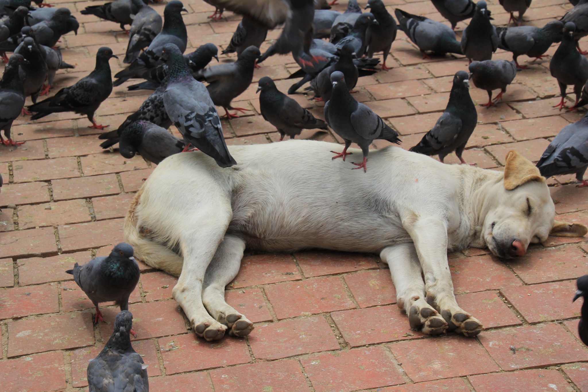 贪睡的狗狗任凭鸽子在它身上踩踏,但它酣睡依就。