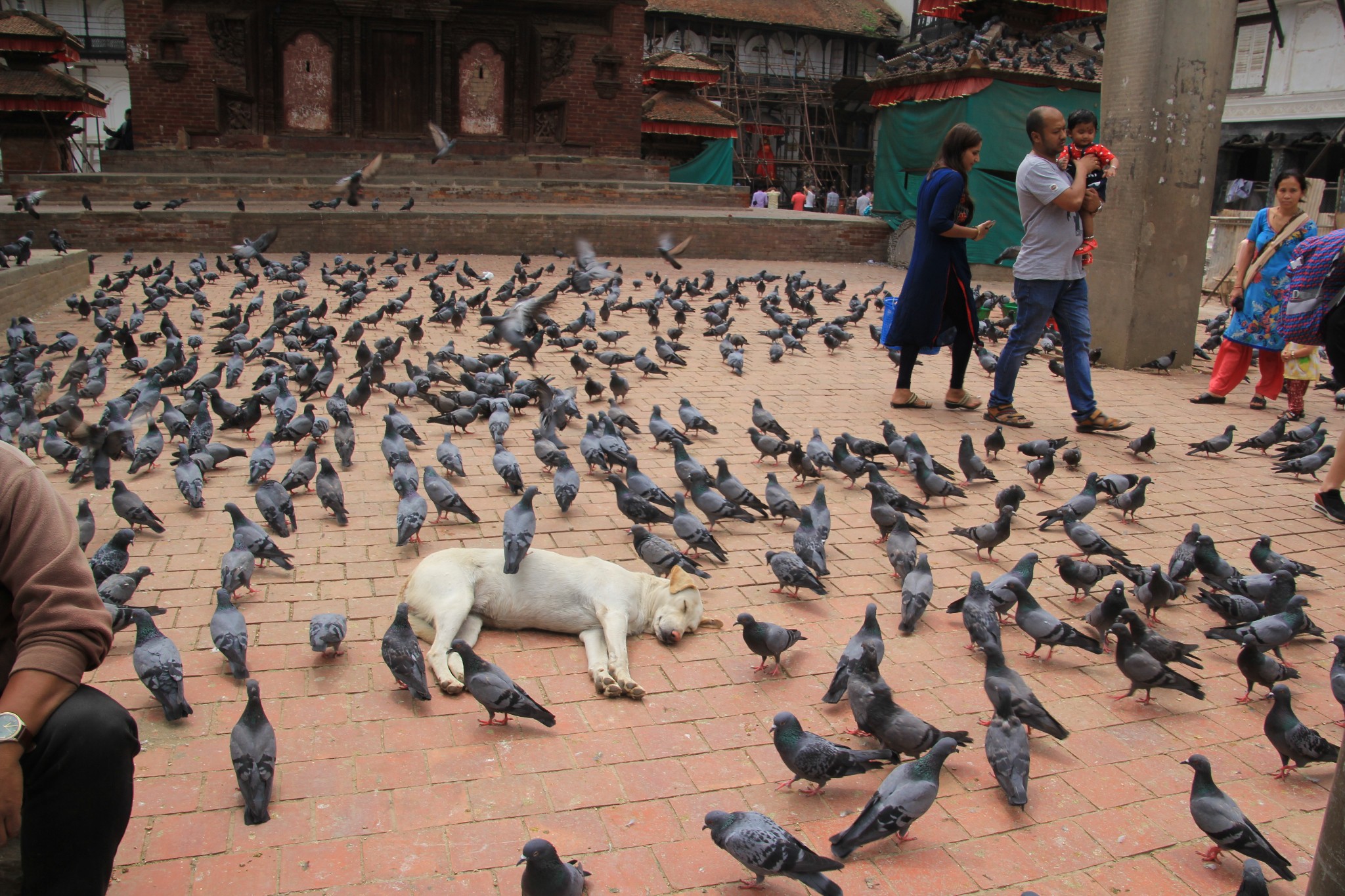 贾格纳特神庙前鸽子成群,一位僧人正在喂鸽子。