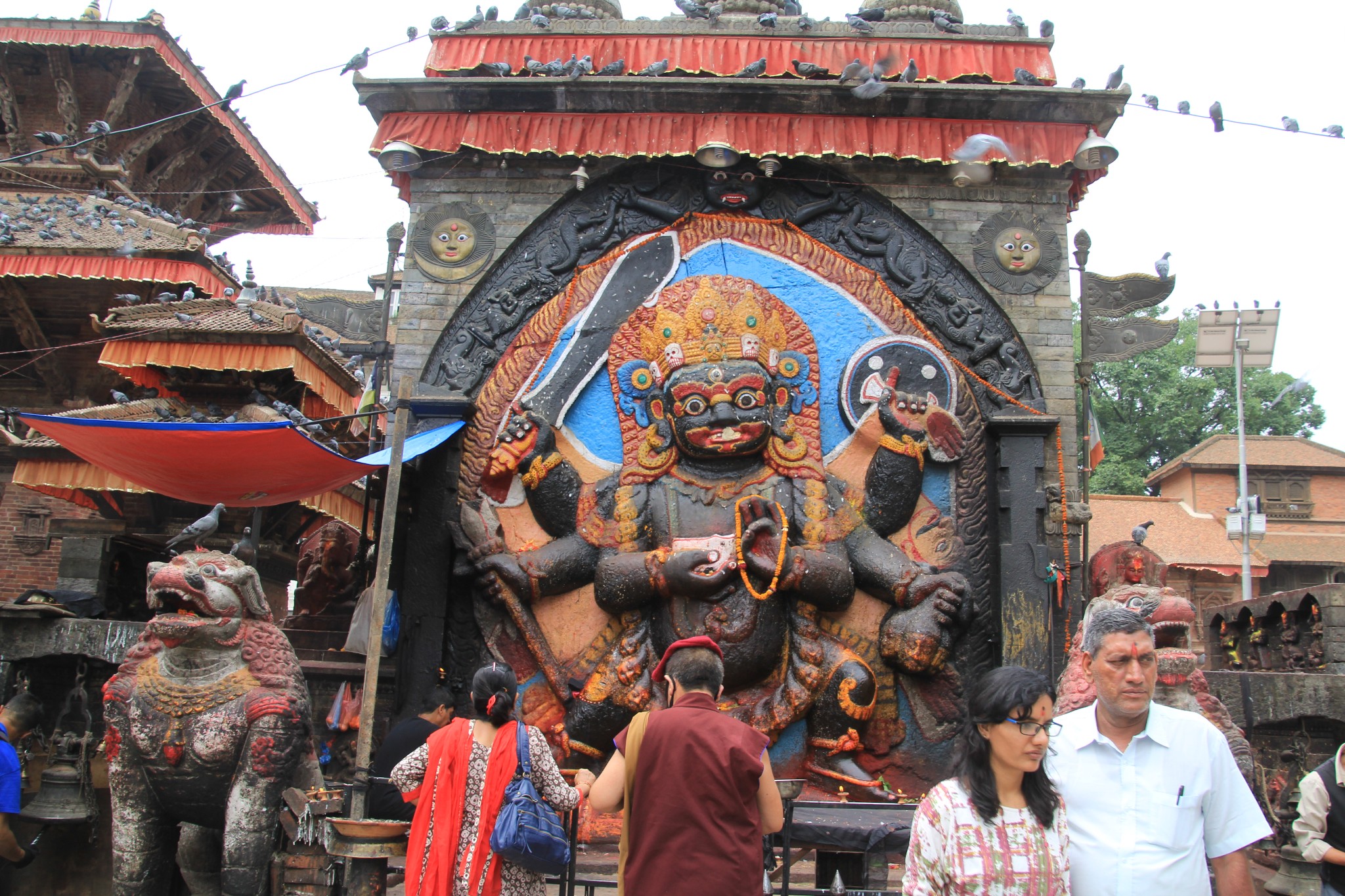 镶嵌在墙壁上的卡尔拜拉弗大型浮雕。黑拜拉弗神像表情狰狞,头戴宝石和头骨制冠饰,白色眼珠及犬齿暴突,几只手分别持有宝剑、斧头、盾牌和头骨,脚底还踩着一副尸体,这座神像是湿婆神最恐怖的化身,大多数的尼泊尔人都相信,如果在黑拜拉弗雕像前撒谎,将来一定会遭受到天谴。