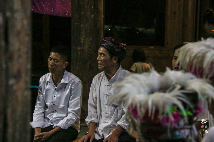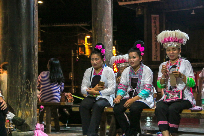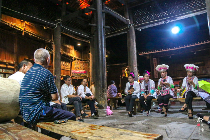 越往寨子的深入,除了风声和雨声,还传来了歌声。循着歌声,我来到了一座鼓楼,鼓楼里的火塘中正烧着篝火,四周围坐着侗家的男男女女们,他们给人的感觉很稀疏平常,我不知道这是他们日常生活自发的对歌,还是景点雇佣他们表演给游客看的。女人们身着侗族的传统服饰,头戴帽冠,手里面还织着针线,而男人们则穿着的更随意一些。女人们唱罢,男人们和唱,我在一旁驻足了许久,不时地也会传来欢声笑语。不管是游客,还是下来打水的村民,经过之时无一不停下来驻足欣赏片刻。尽管我听不懂他们所唱的内容,但是不得不说,这悠扬的旋律第一次把我给吸引住了,是自然发声的天籁,之前从来没觉得西南地区少数民族的旋律这么好听过。