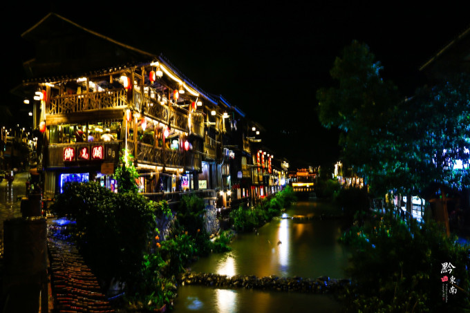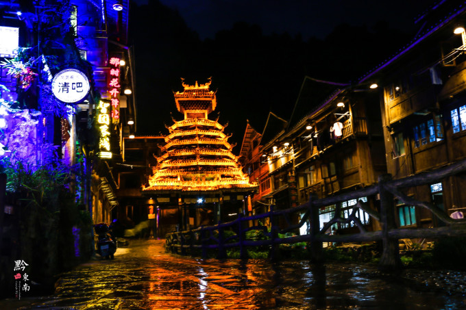 雨夜肇兴,别样的风情。雨势比刚到的时候要小了很多,寨子里灯火通明,街上的行人也渐渐多了起来。主街沿街的餐馆老板们在店前架起了遮阳棚,结伴出行的游客们正把酒言欢,抛却了城市里的烦恼,好不快活。