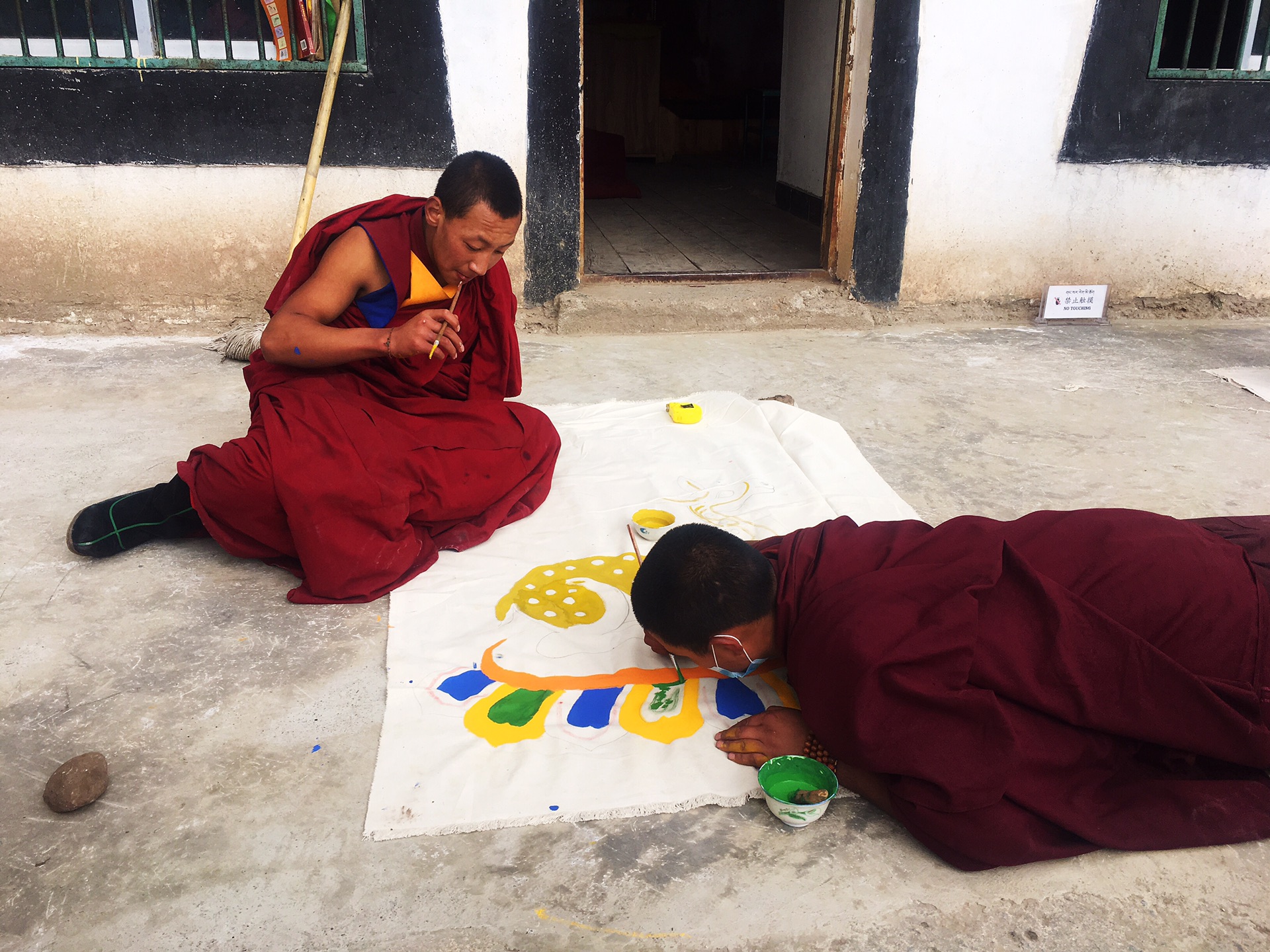 趴在地上描绘唐卡的喇嘛们