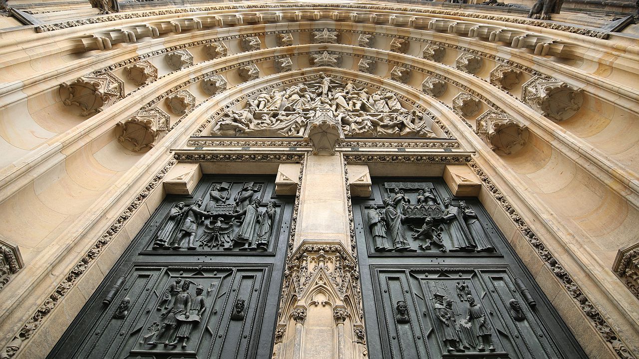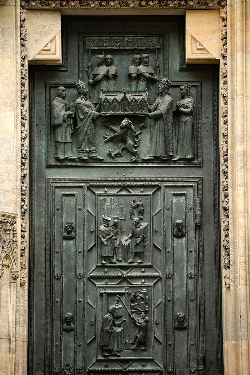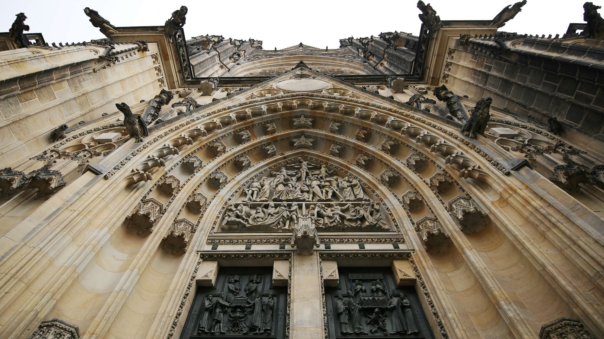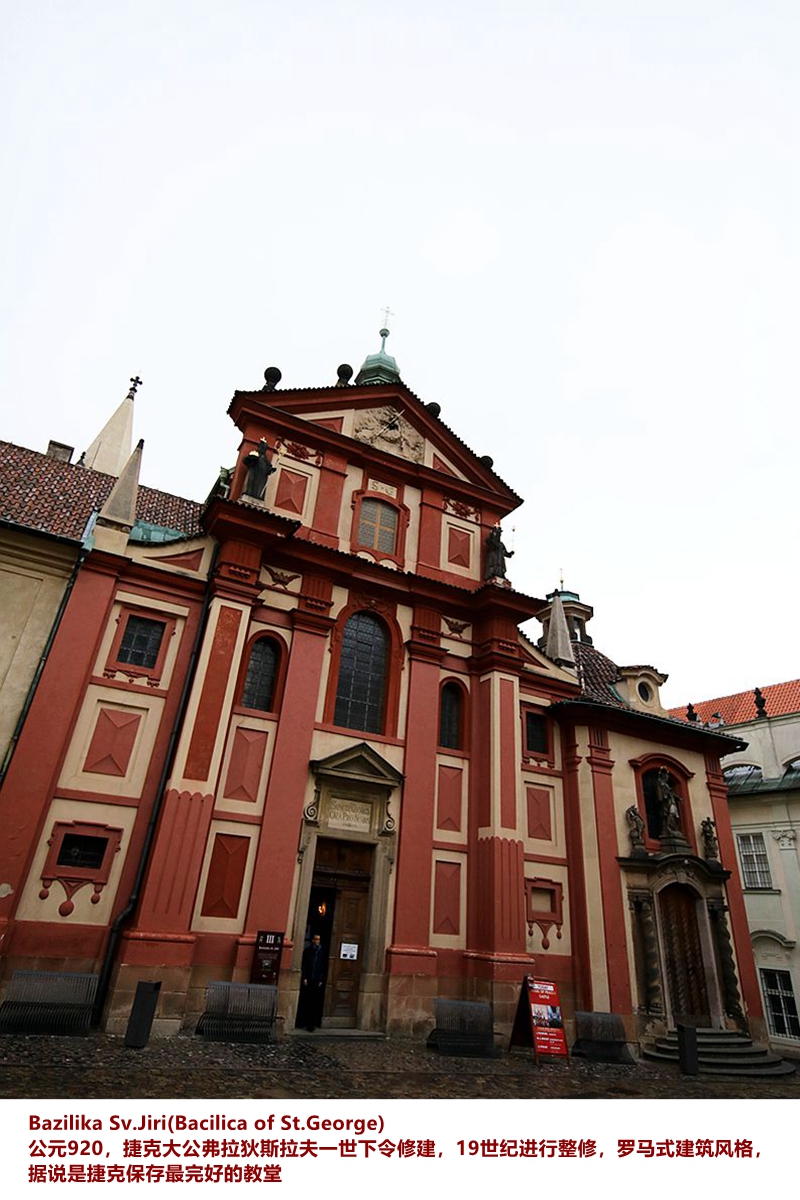 从展室出来,向东便是圣伊瑞主教堂,该教堂因门头的屠龙圣乔治雕像而被人们习惯称之为“圣乔治教堂”,教堂后面是圣乔治女修道院。教堂于公元920年按照当时捷克大公弗拉狄斯拉夫一世的命令修建。19世纪进行了大规模修复,目前这座教堂是捷克保存最完好的古罗马风格的教堂。