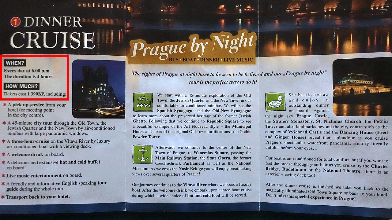 领队一再催促确认第二天是否接受自费项目~“人骨教堂”和“乘船游览伏尔塔瓦河”。原本想乘船观赏布拉格城堡和查理大桥的夜景,当询问是否可行时,领队却面露难色,推说不好看。而此时,其他团员已爽快接受了领队推荐的“自费项目”,无奈我们也只得接受白天乘船观看查理大桥(按照当地广告:乘船夜游布拉格三个小时,含晚餐和一杯开胃饮料,报价39欧元;2.5小时乘船夜游城堡,含晚餐只需59欧元;白天乘船游览都很廉价,不含餐)。顾忌与领队关系搞僵,只婉拒了往返需要三个小时的“人骨教堂之旅”,并推说准备去国立美术馆,因为在布拉格只停留两天,而美术馆周一闭馆休息。