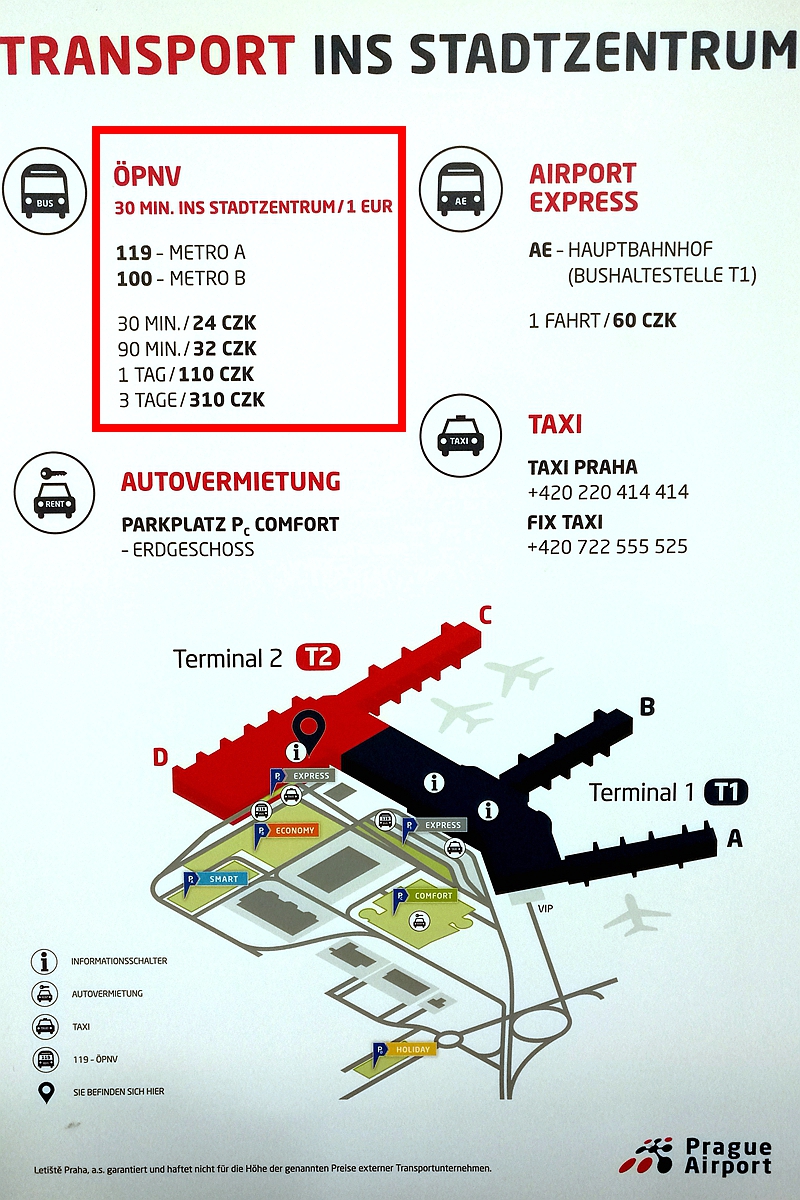 在机场等行李时,无意中看到一张给“进城”的德国游客的提示图。注意红框内:地铁和公交巴士是按照乘坐时间收费的。时长分别为: 30分钟、90分钟、24小时和72小时,票价依次为24克朗、32克朗、110克朗、310克朗。