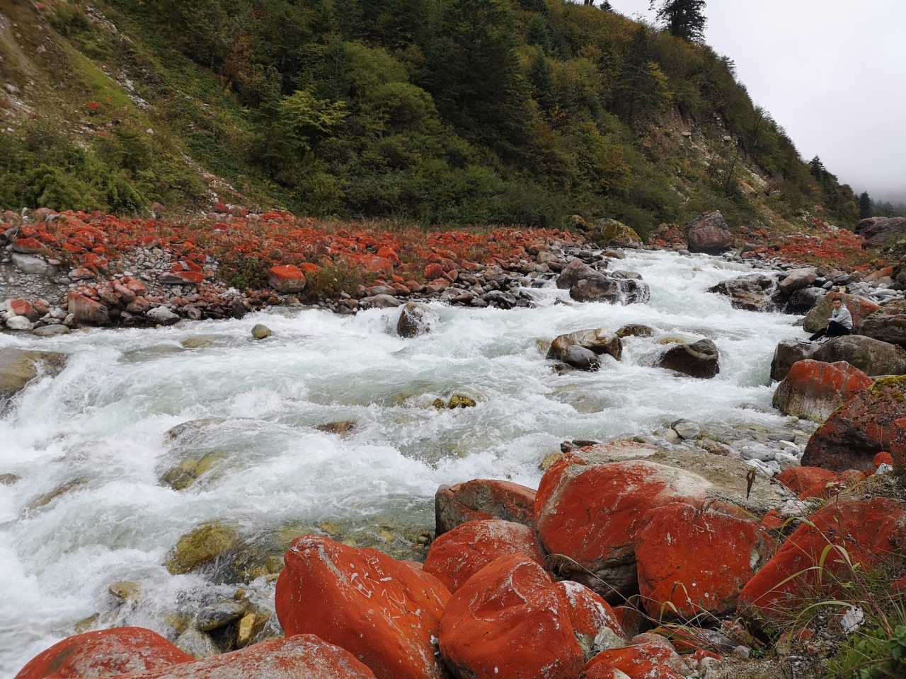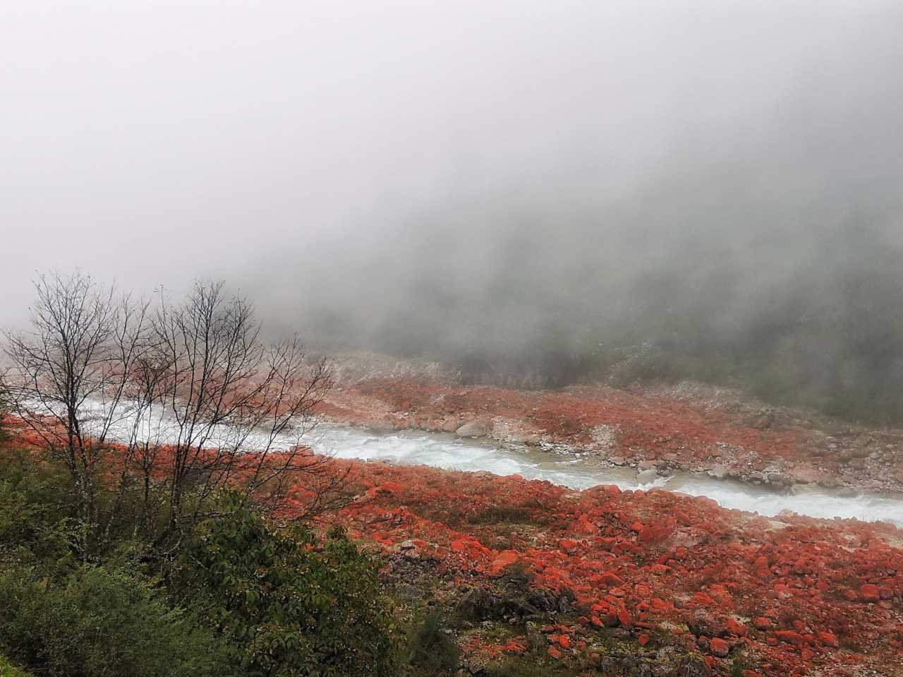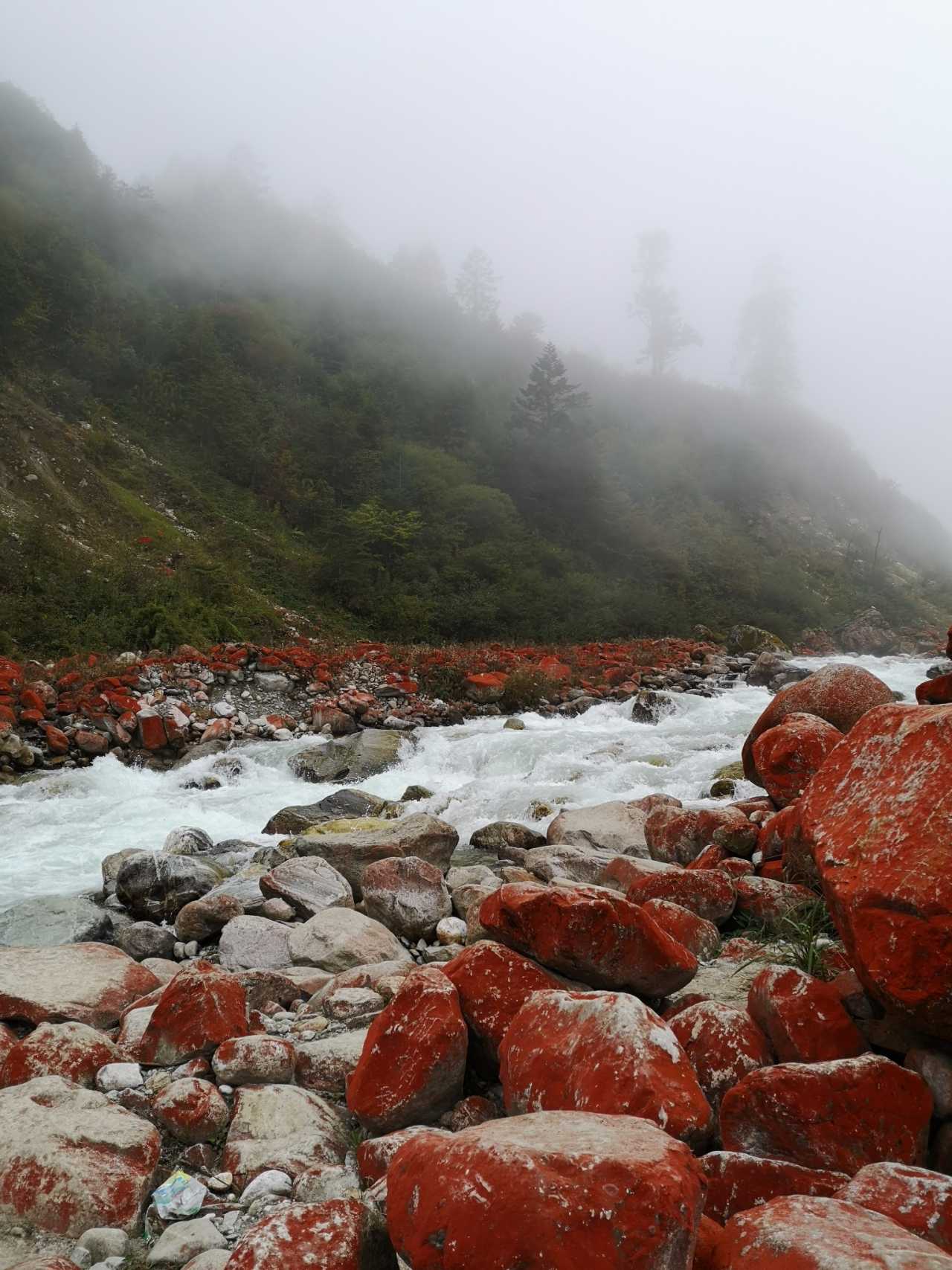 距离磨西古镇30公里,车程一小时左右,有一个红石公园非常值得一看。景点不大,汽车可停靠在路边,步行到河边游览红石滩。
