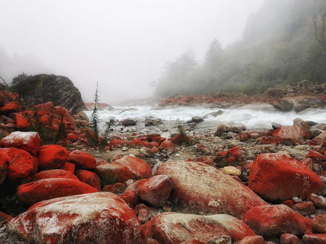 在贡嘎山周边,散落在山间尤其是溪水流经之处的花岗岩,因其上附着一层红色的藻类(乔利橘色藻,因富含胡罗卜素,故在阳光照耀下呈鲜红色),故被称为红石。燕子沟是世界上红石最多最集中的地方。