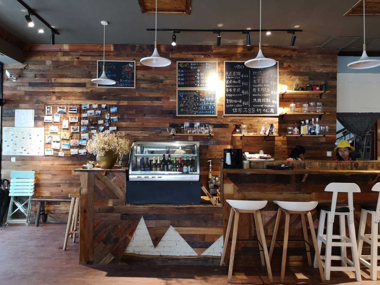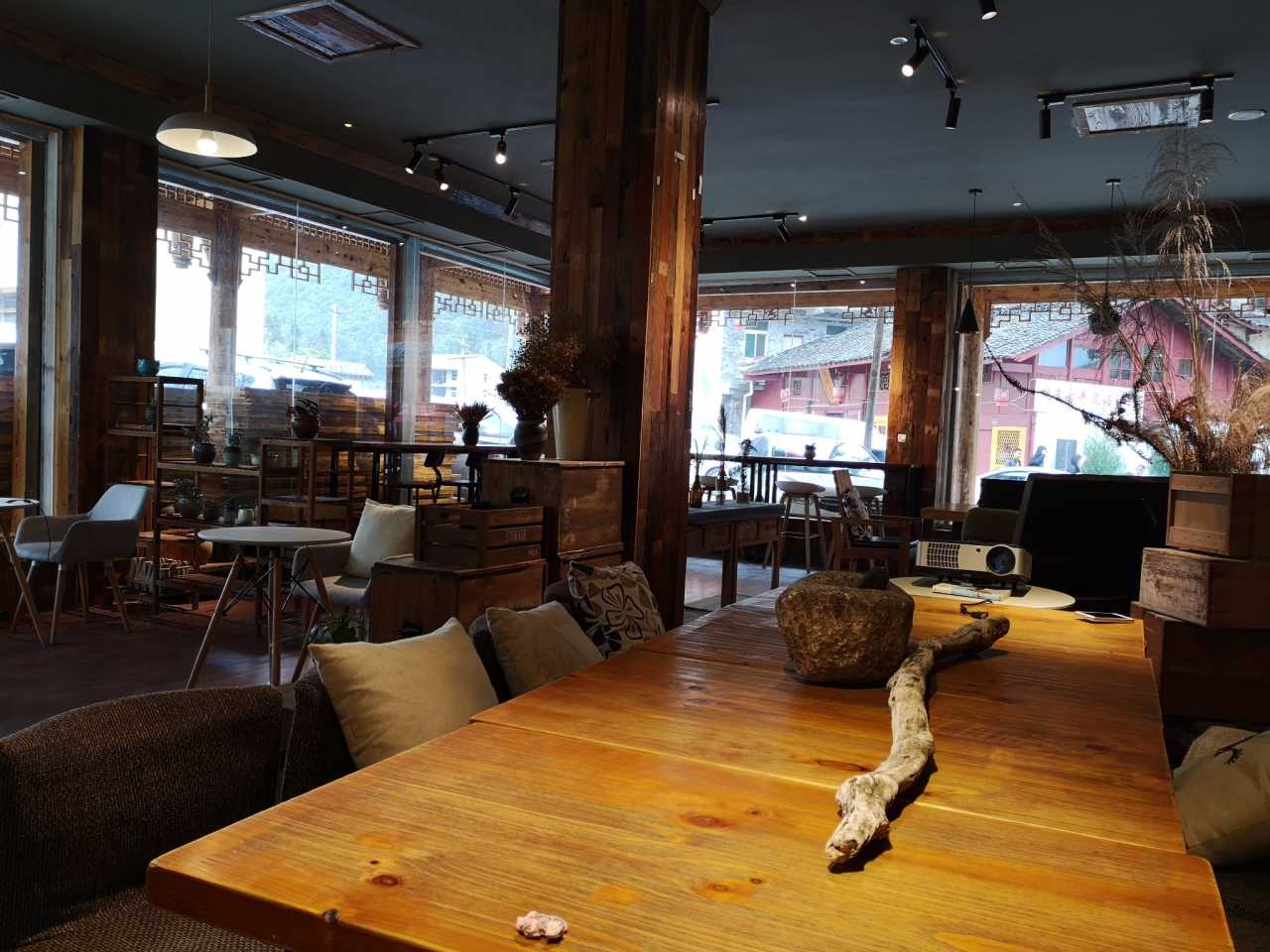 客栈是一周前在携程上订的,国庆期间价格翻了三倍,我们本着“舒适干净就好”的原则,选择了一家叫“晓拾”的客栈。客栈位于磨西古镇一座观音庙的旁边,外观并不起眼,一楼大堂却惹得人见人爱。大堂其实是一个咖啡吧&酒吧,原木色调、清新文艺风,让人舒服惬意。孩子们最喜欢这样的住宿,有一个公共区域可以任她们玩耍,而不是回了酒店就只能待在房间里。朵朵和逗逗告诉我,出去这么多次,她们最喜欢的住宿是花水湾的那栋别墅,那天晚上我们是大大小小一群人挤在客厅里看电影,独生子女的寂寞我懂,孩子们很在意和小朋友之间的交流,喜欢这种把朋友相处成家人、热热闹闹的感觉。