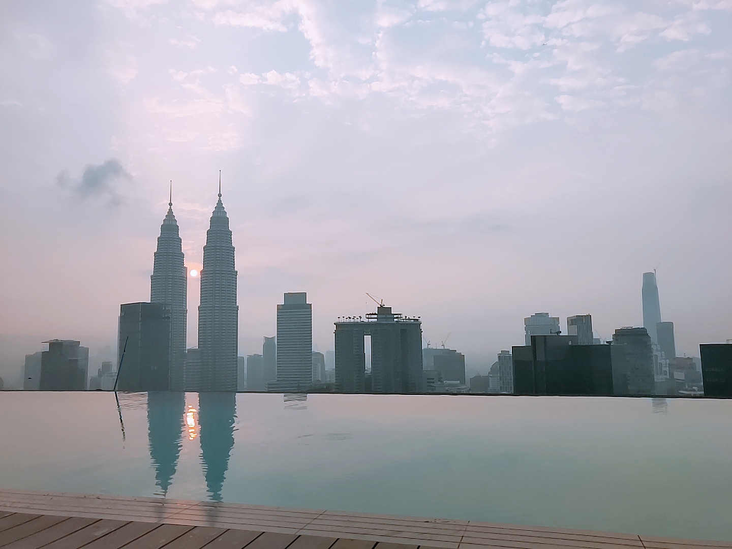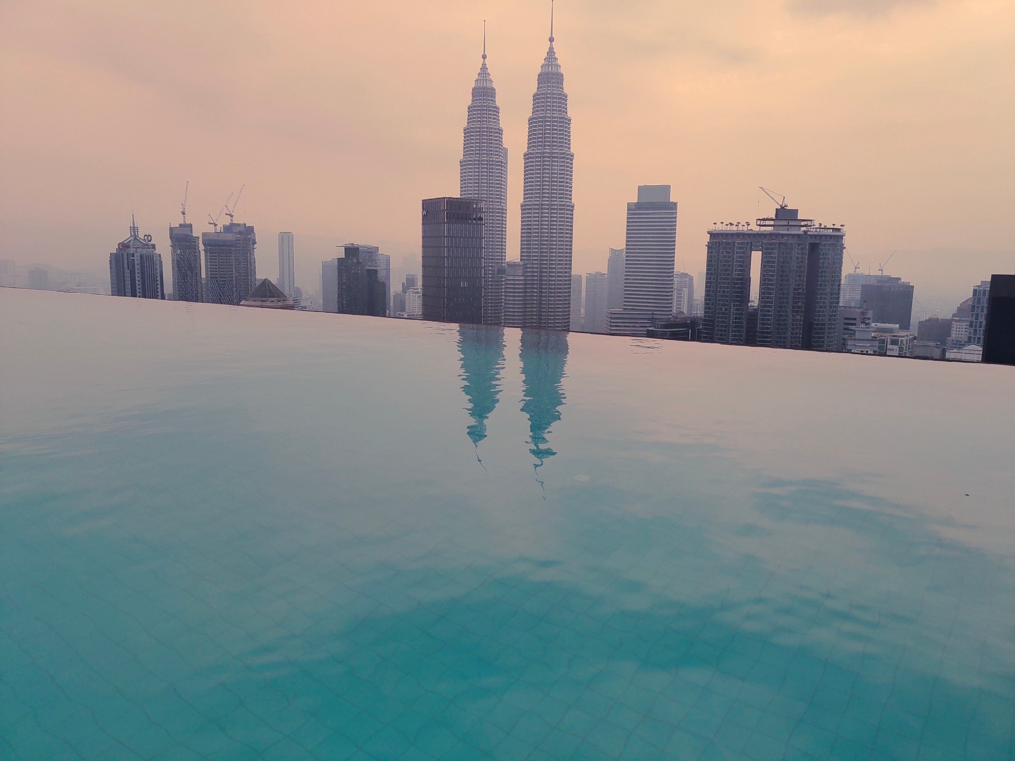 1.住:网红酒店,The Face Suits或者叫Platinum Suits,是酒店和公寓式套房合在一起的一幢楼,国庆期间在booking上订的公寓套房,600一晚,酒店我看了下要800+,51层是无边泳池,不管是酒店还是公寓,刷房卡都可以上,双子塔和吉隆坡直接当背景随便拍照,效果超棒。