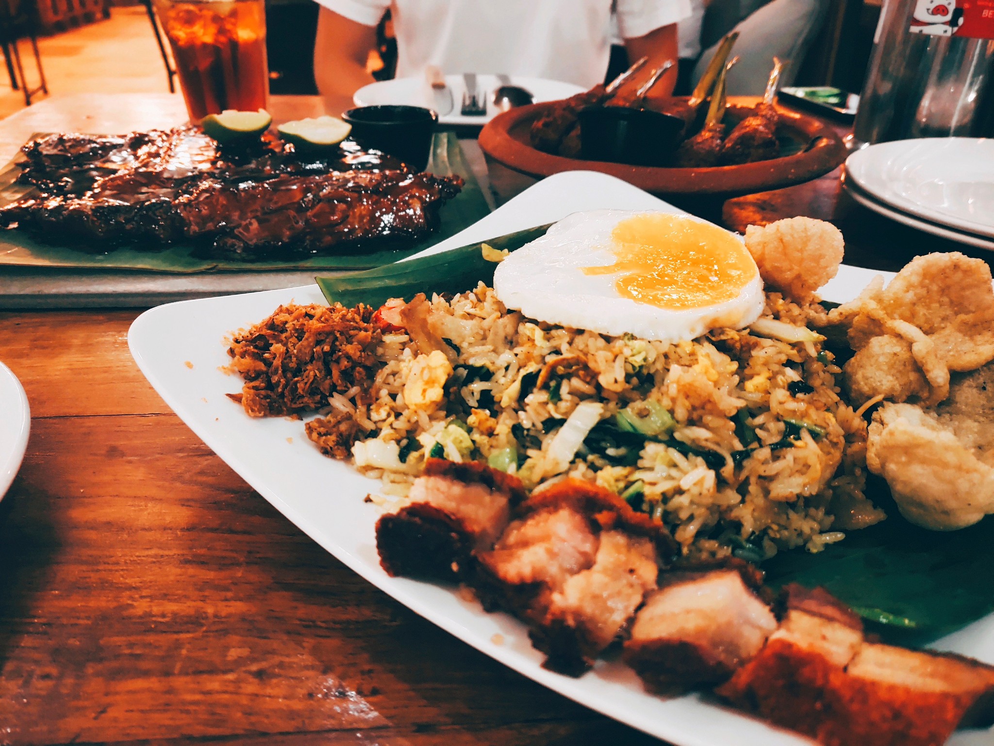 2.1Naughty Nuri's,第一天晚上check-in完都已经十点多了,就在住处附近找到了这家好评很高的餐厅,很不错。必点大猪排,40+马币,BBQ是几串肉串,用香茅草串起来烤的,然后还点了印尼炒饭。两个人根本吃不完·····切忌别点多了,大猪排很腻的。