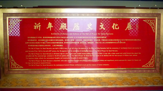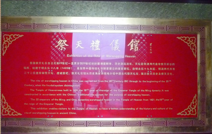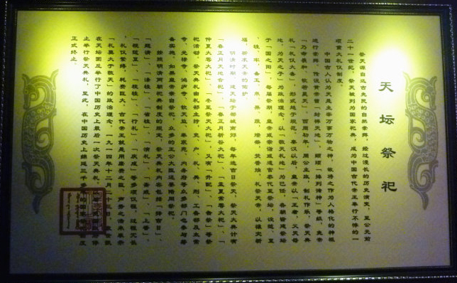 现在东配殿为《祈年殿历史文化展 》。西配殿辟为《祭天礼仪馆》,馆内集中介绍了中国祭天礼仪的演变过程,重点展示了清代祭天大典的礼仪情况,包括祭天礼器、祭天程序等等。
