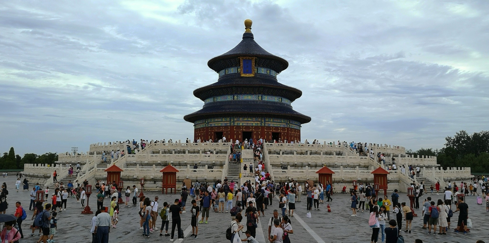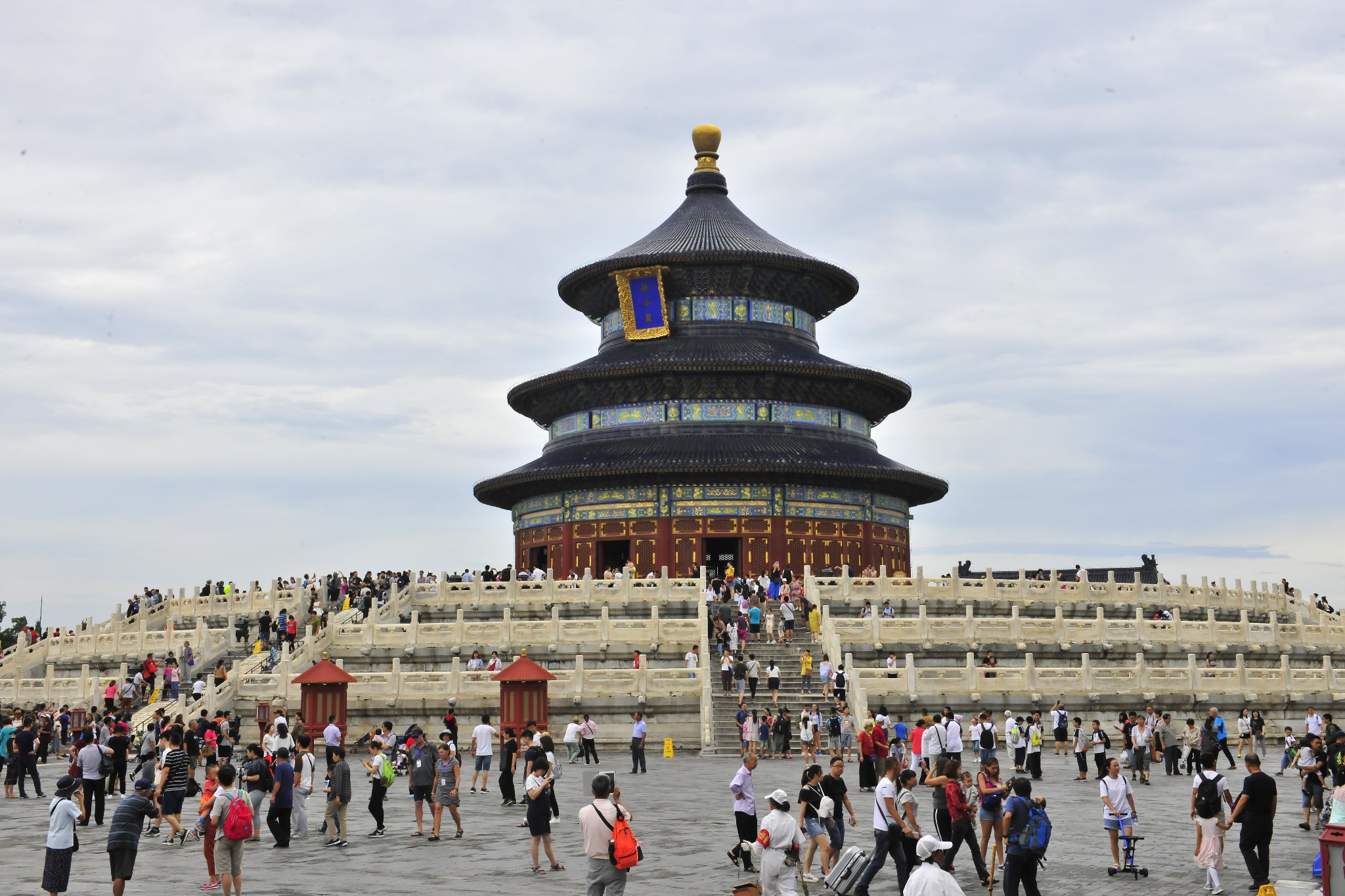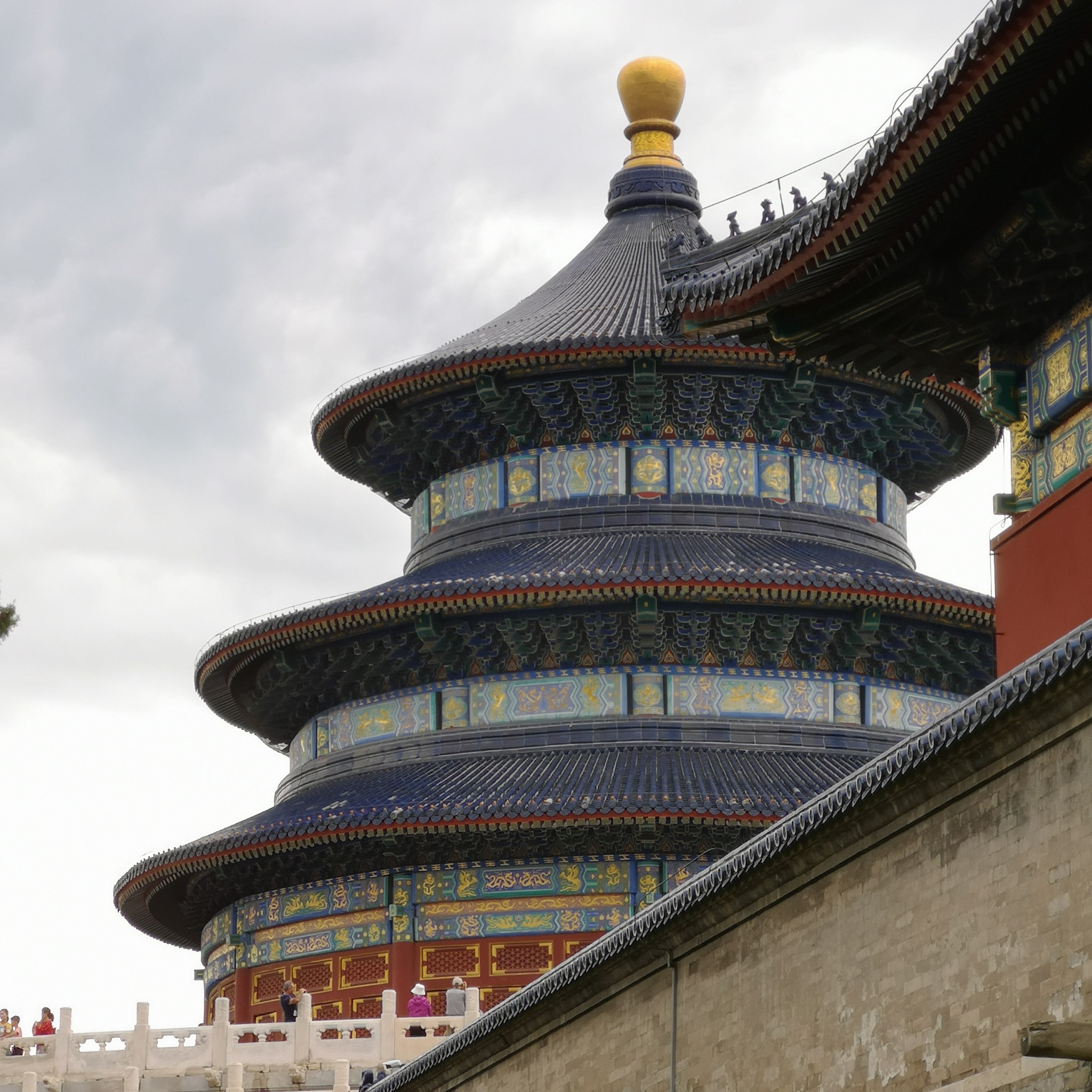 祈年殿是一座直径32.72米的圆形建筑,鎏金宝顶蓝瓦三重檐攒尖顶,层层收进,总高38米。