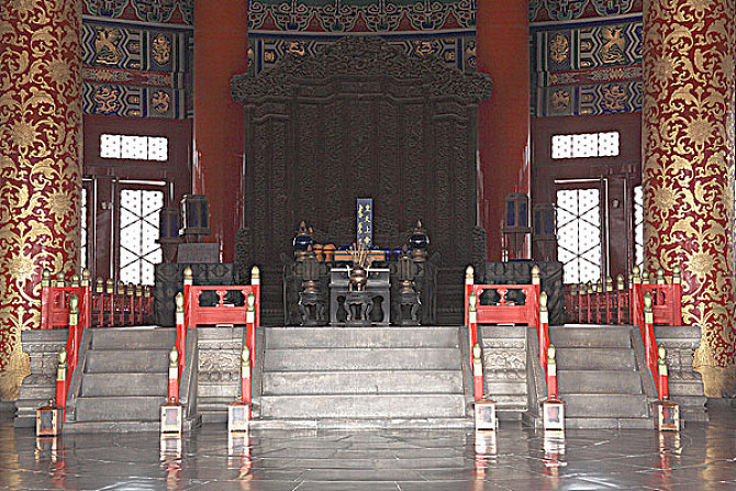 祈年殿的藻井是由两层斗栱及一层天花组成,中间为金色龙凤浮雕,结构精巧,富丽华贵,使整座殿堂显得十分富丽堂皇。