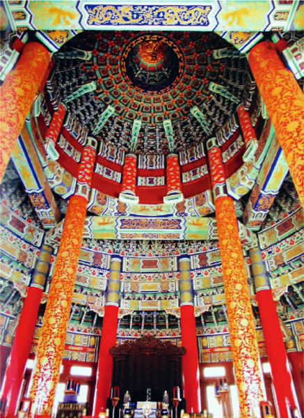 祈年殿的内部结构比较独特:不用大梁和长檩,仅用楠木柱和枋桷相互衔接支撑屋顶。