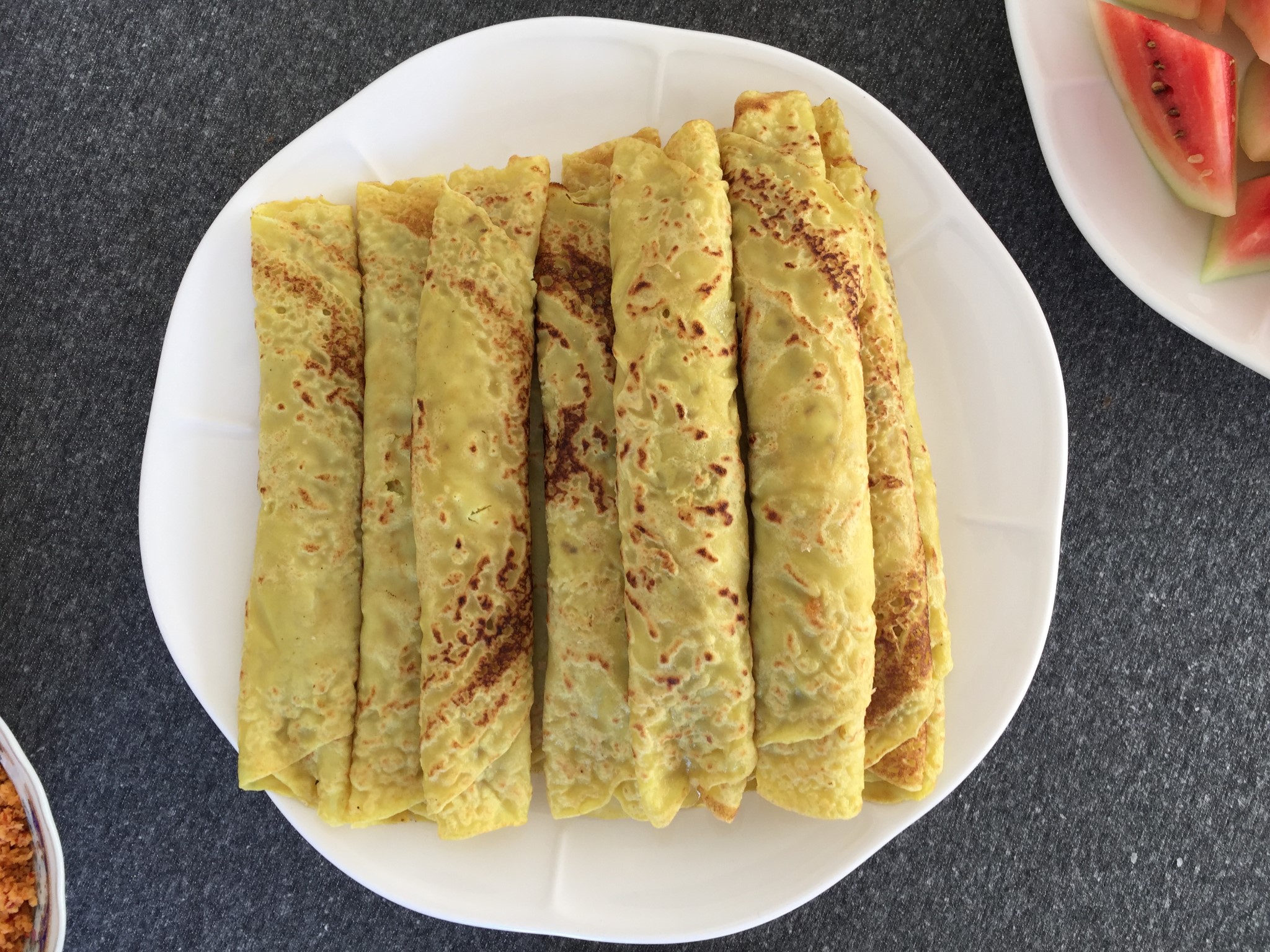 ↑ 煎饼卷。将由小麦粉,椰奶,鸡蛋和姜黄制成的面糊倒在热锅上,加上新鲜的磨碎椰子,棕榈糖和香料。然后将煎饼卷成一个整齐的小包裹。