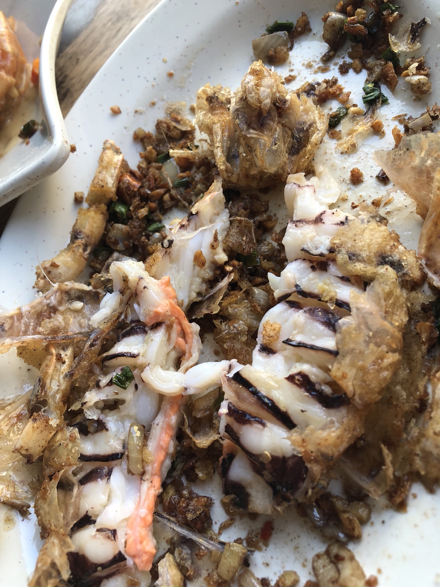 回到镇上,先去到后天的集合地踩点,不过到了相邻的酒店后就是找不到集合地,就想那天来了再看。期间意外地找到了朋友推荐的餐馆 “新口味餐厅”,这家店果然名不虚传,味道超级赞,导致后面几天,我们每顿饭都在这吃,顿顿吃撑! 第一天吃的是椒盐皮皮虾,奶油虾,蒜蓉包菜,海鲜炒米粉!98.5RM,心满意足地回酒店。