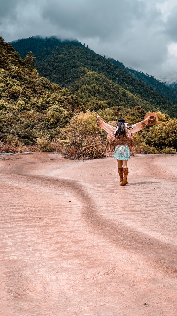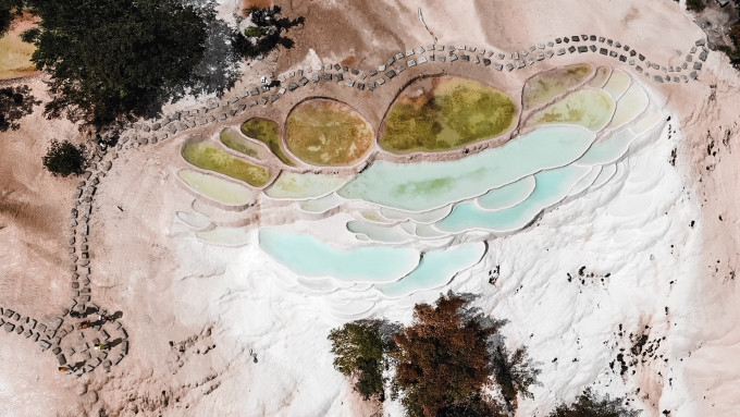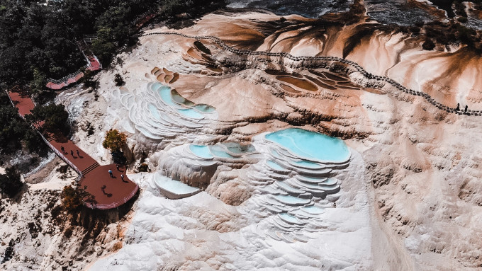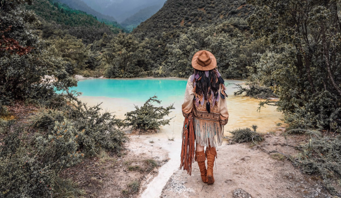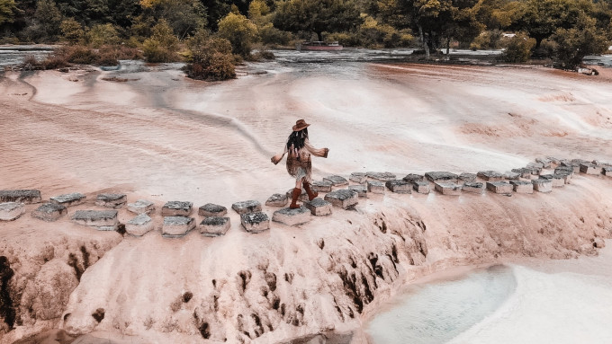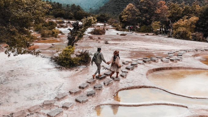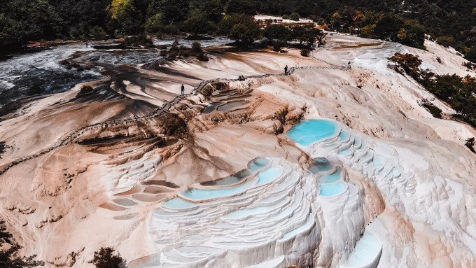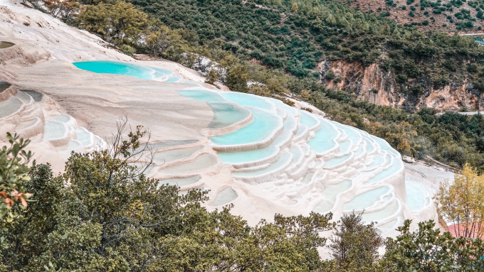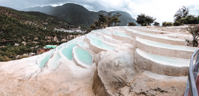 可抵达位于哈巴雪山麓的白水台,含碳酸氢钙的泉水慢慢下流,碳酸盐逐渐沉淀,长年累月就形成台幔,好似层层梯田,被称为“仙人遗田”。