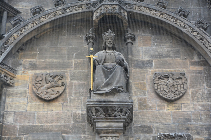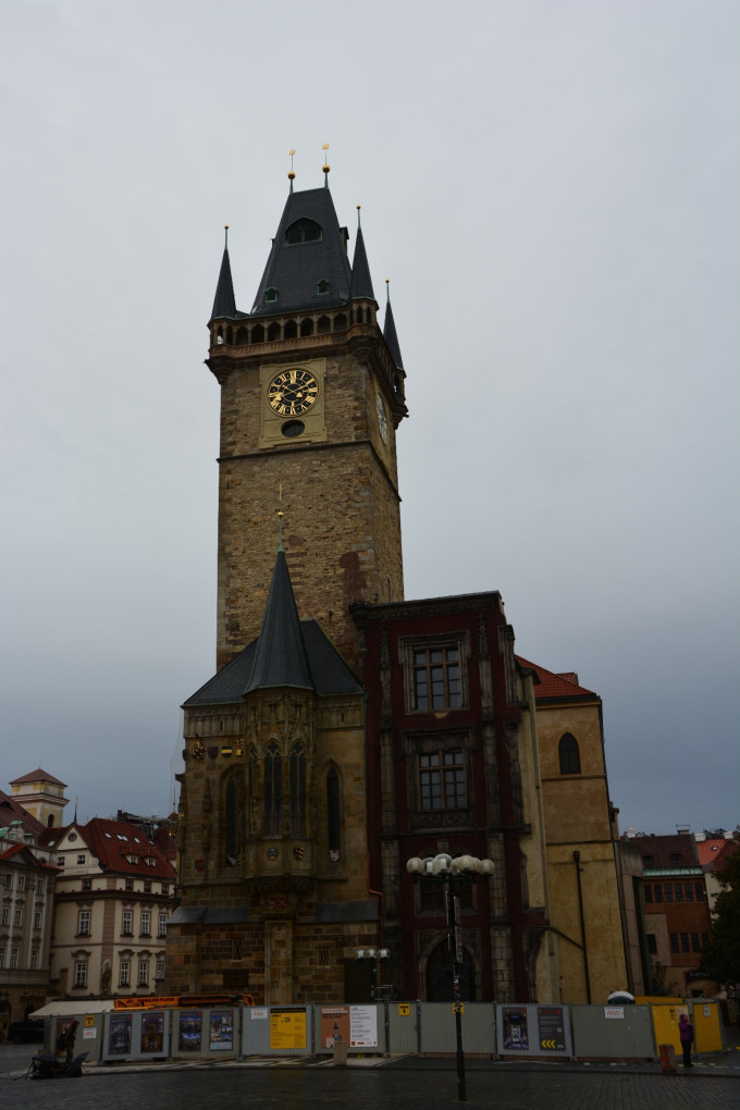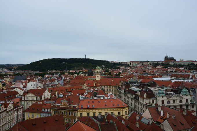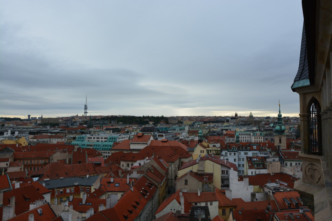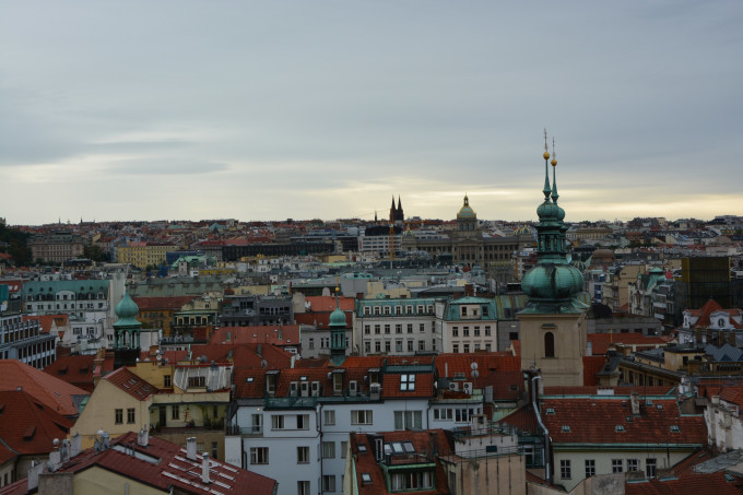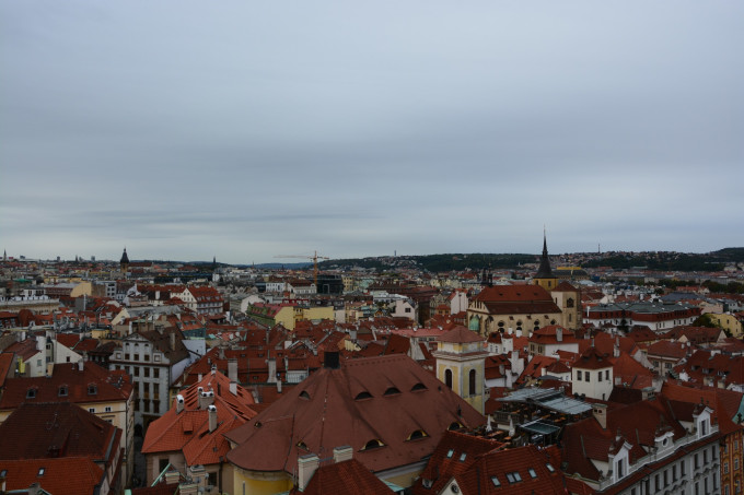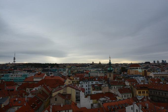 等着九点钟市政厅和天文钟开门,花了250克朗,赶着第一批就上了钟楼顶。楼顶观景台位置有限,要是再晚来一些,恐怕就只能跟在其他游客的屁股后面慢慢挪动了,因为上来的早,在楼顶绕着圈子施展也没有阻碍,只是可惜天气不好,拍不出晴天有云时老城广场那种清新文艺的格调来,后面的查理大桥、伏尔塔瓦河和布拉格城堡也都是如此。说实话,第一天的摄影结果是不能让人满意的,只能说看到了这样的布拉格,可惜这个坏天气下的布拉格就像美丽的女子没有精心装扮,总是少了一些让人惊艳的感觉。不过好在我心心念念记挂着布拉格的美好,趁着第二天云开日出的机会,又去伏尔塔瓦河两岸暴走了三万多步补拍照片,算是聊表心意给布拉格补妆了吧。