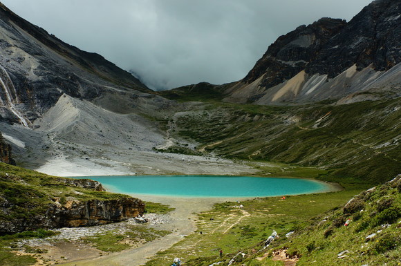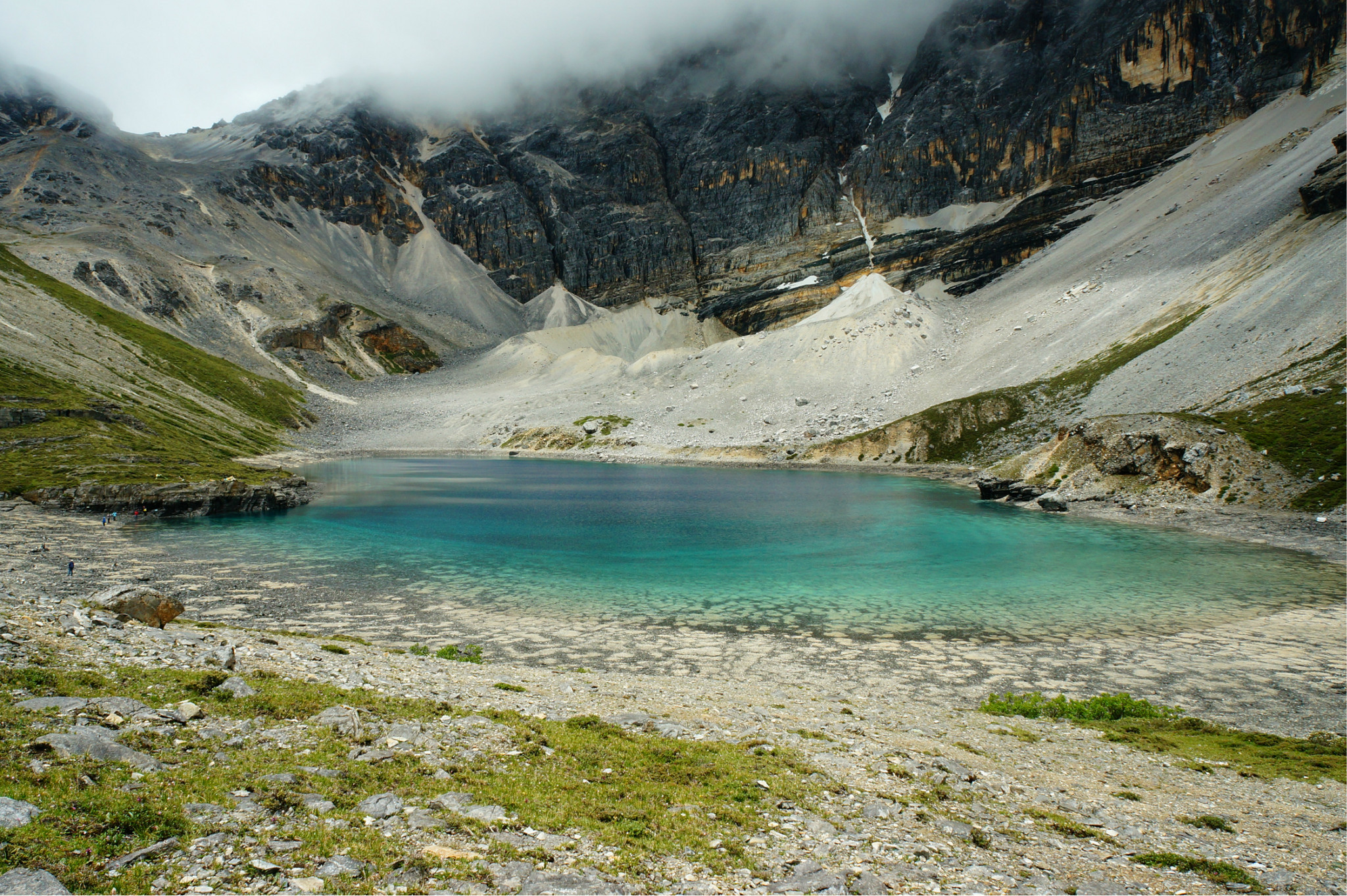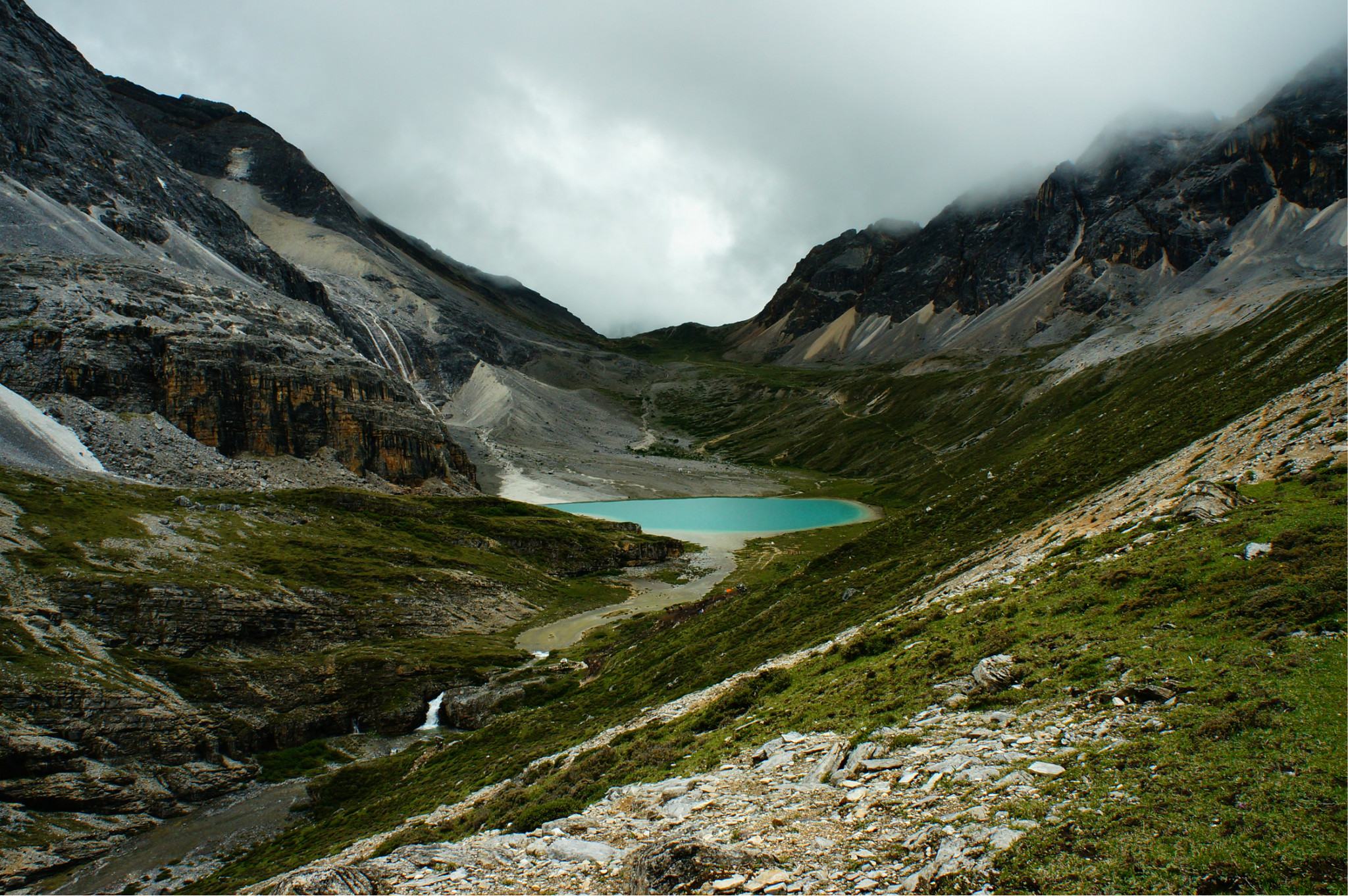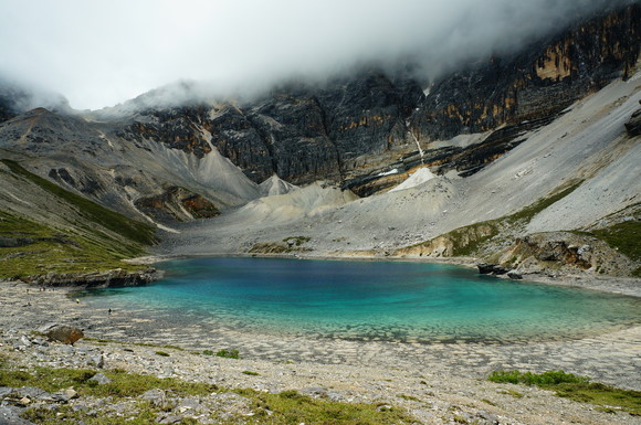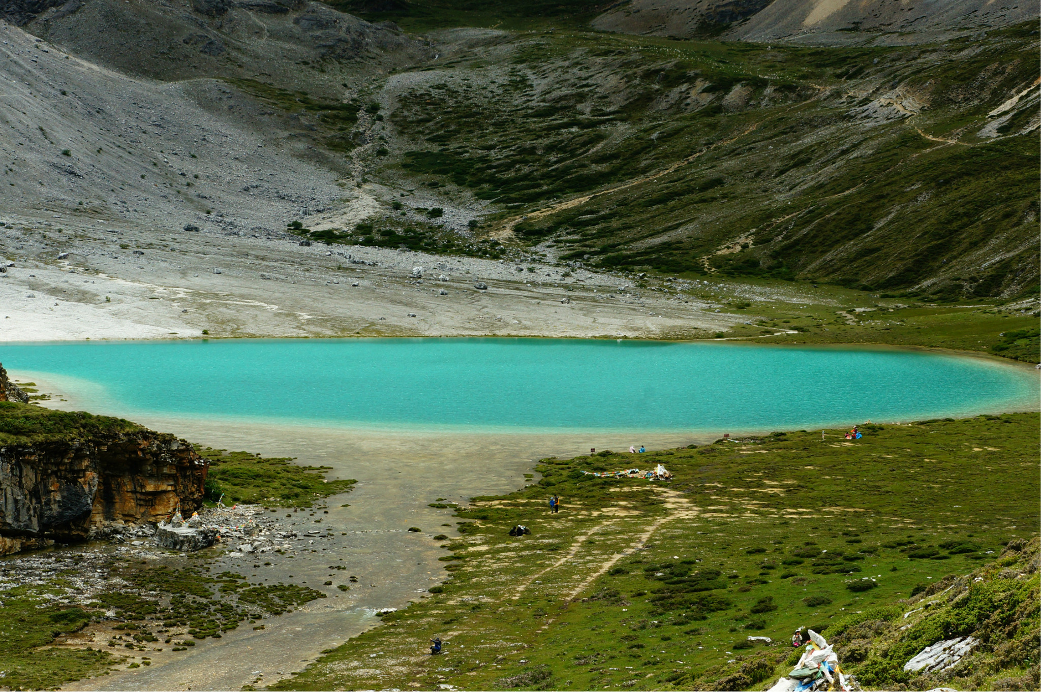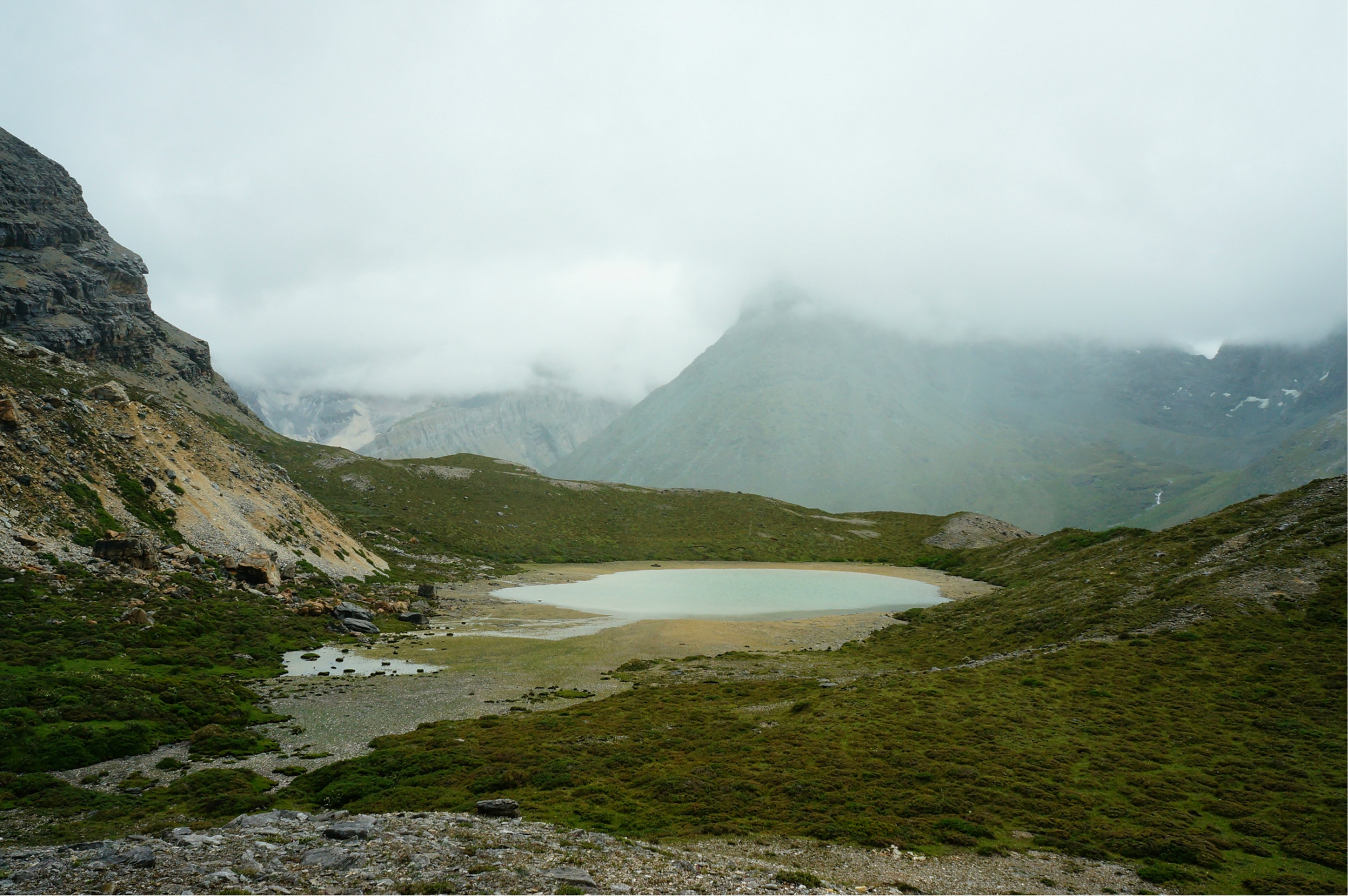 第 二天7点10分出发,脚踝依然肿胀疼痛,赶上旅社第二班班车,7:38到了登山道,8:33到了冲古寺,坐电瓶车8:58到达洛绒牛场,11:42到达牛 奶海。这段路很是不好走,山间小道,全是烂泥,各种马粪,上下坡道幅度比较大。我们三个跟路上结识的刚研究生毕业的李医生同行,我跟爬山李还算好,王肉跟 一刀大师后来是一点一点一步一步慢慢上来的,每一步都是超越极限。到了牛奶海后由于我脚踝疼痛,与一刀大师在山上订了下山的马匹,爬山李和王肉决定徒步下 山。因为爬山李他们的车下午四点就离开,他俩没呆多久就下山了。我跟一刀大师由于等马匹在五色海多呆了将近两个小时,其间有一会儿山上出了太阳,湖水呈现 出及其美丽的颜色,加上远处从云雾中显现出来的神山,当时我就觉得在山上这时间值了。