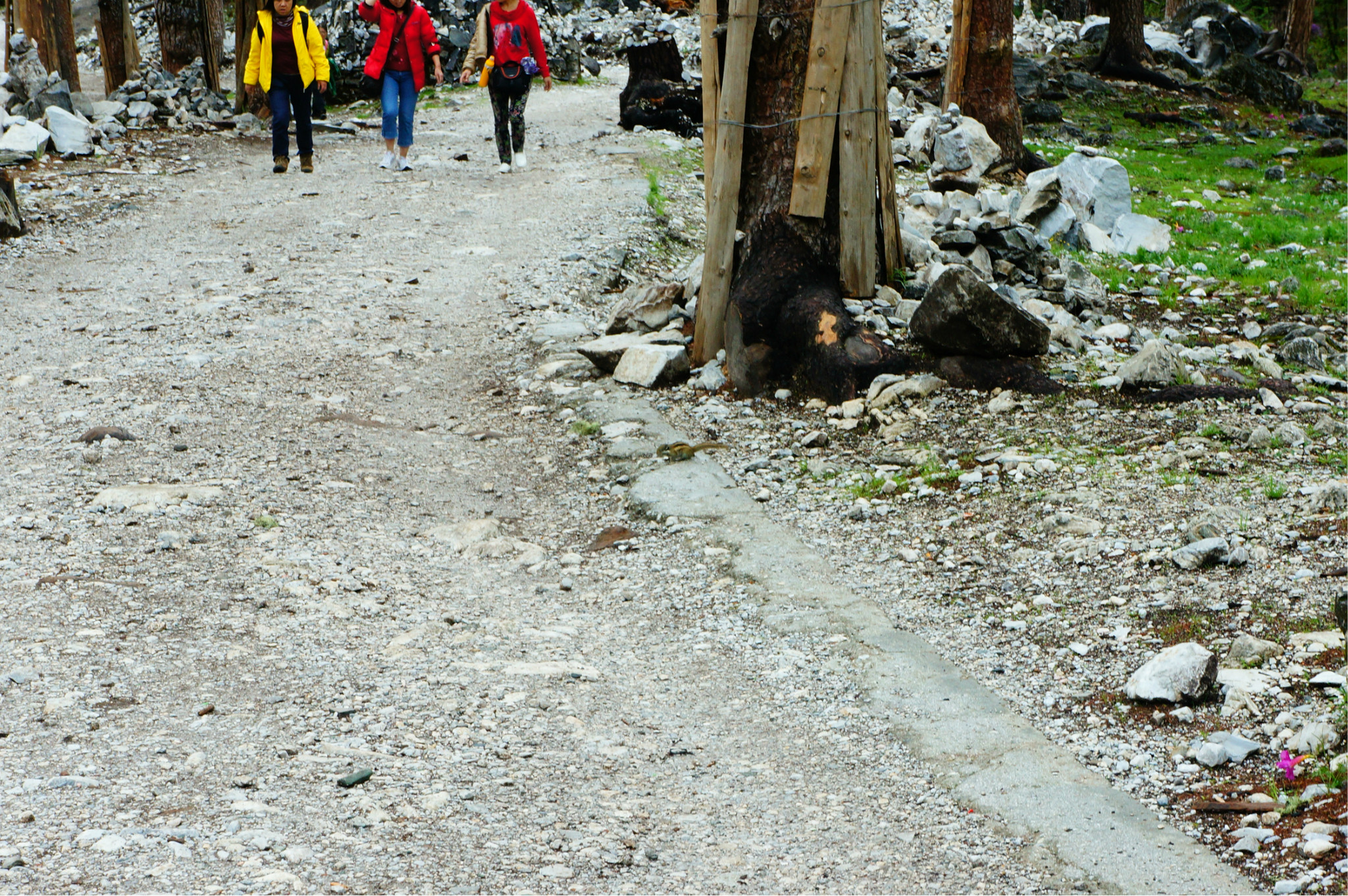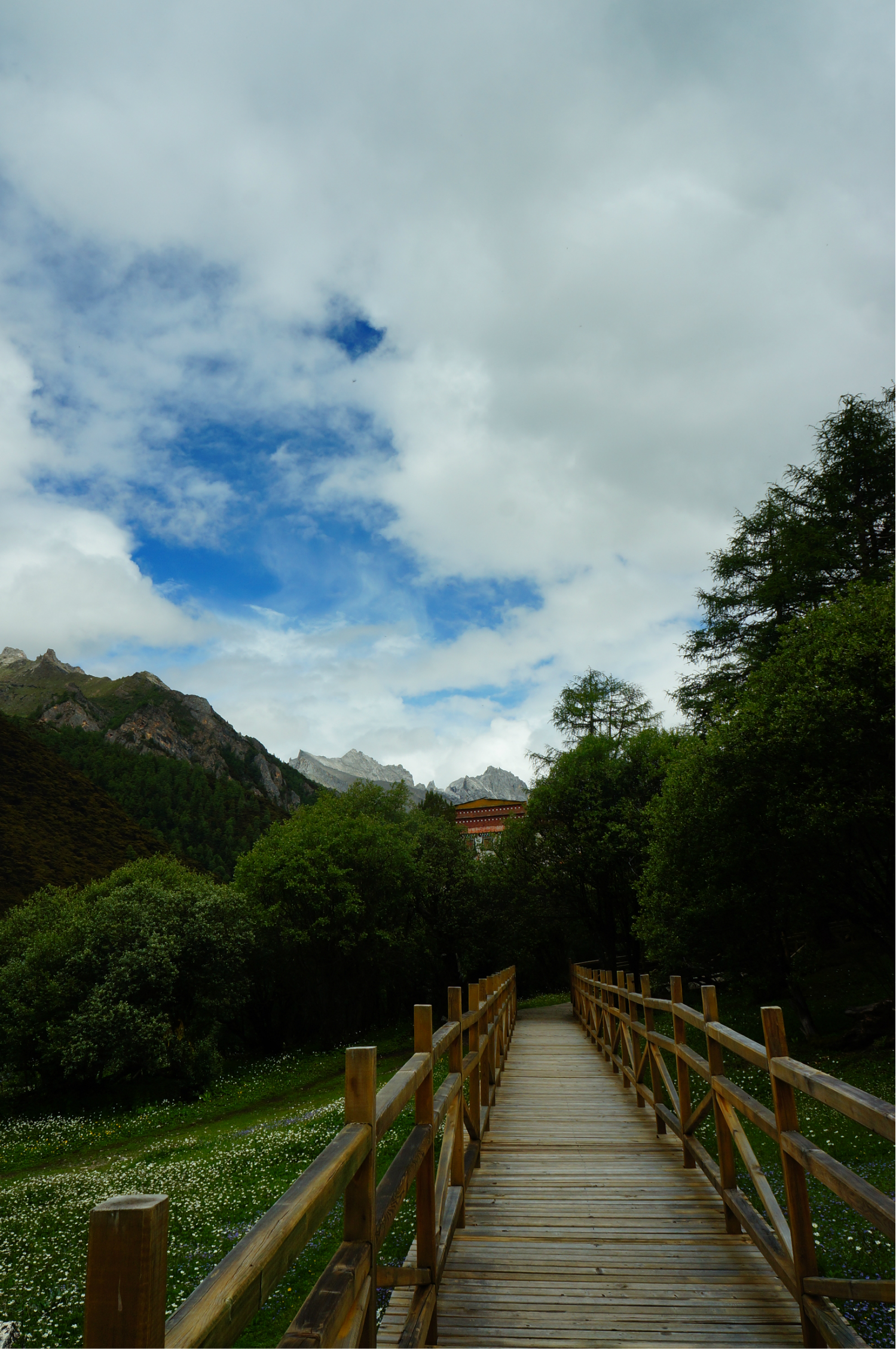 拿这张图说明一下,这是下了电瓶车后,身后就是洛绒牛场,最右边那小房子就是上山骑马的租用点,草地上那几个点就是徒步的路,可不是像这边是栈道,远看看不出来,从这开始就是山路了,像我们这时候是雨季就全是烂泥和马粪的混合体╮(╯▽╰)╭