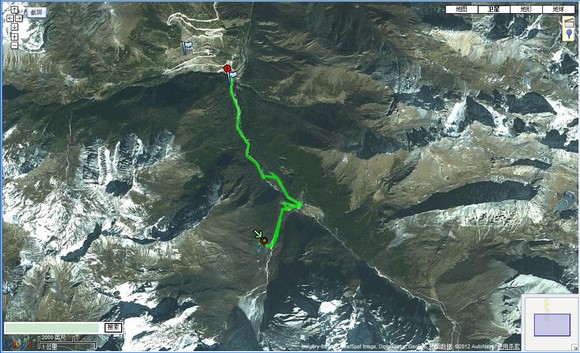 下图绿色的是第一天要步行的路,第二天为紫色的,先重复第一天走的一大段路,然后从冲古寺(绿紫交界处)到洛绒牛场(沿紫线往下第一个红点)那边是坐电瓶车,后面便都是步行,当然骑马也可,不过建议步行上山。