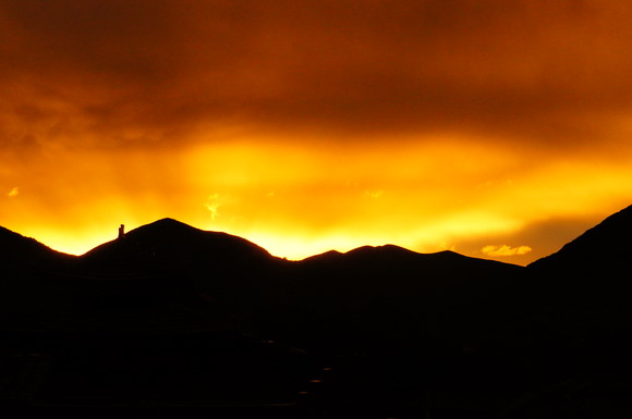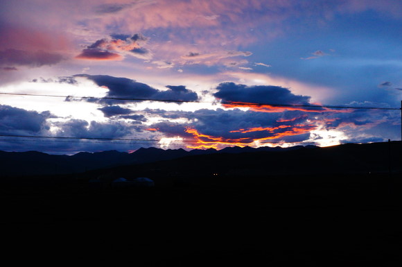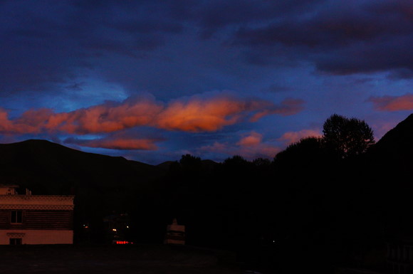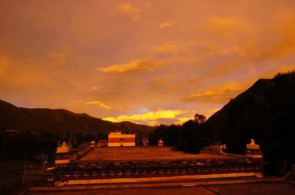 一路狂奔,晚上8点才到达理塘 。速度搞定晚饭后,我们继续赶路,路上正巧看到火烧云~~~