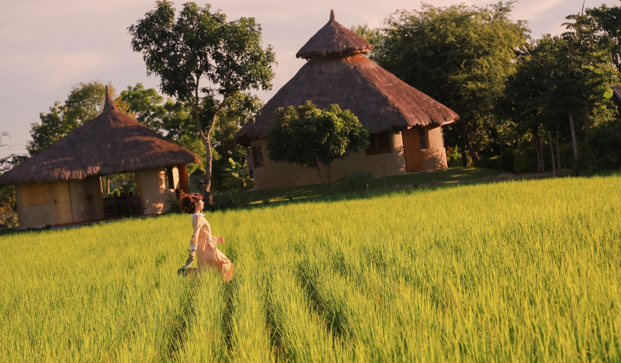 下了车,走过河堤小路,我们来到Bee乡下的家。这是一座用土墙砌成的茅草屋,在阳光下闪烁着细碎的光芒。
