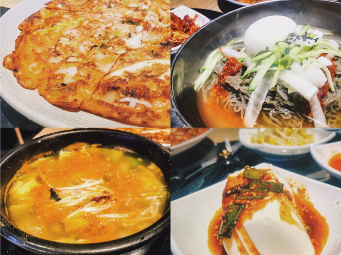 只随便用了手机凑合拍了下来。想尝尝和在广州吃的韩式料理味道是不是一样。嗯呐~果真不一样,泡菜海鲜饼比我脸都大一倍,面粉和泡菜海鲜的比例刚刚好,面粉下的没有我们那儿多,味道棒棒哒。个人就觉得冷面和豆腐汤吧味道就和在沈阳和大连朝鲜菜馆那儿差不多,送的小菜分量很足。
