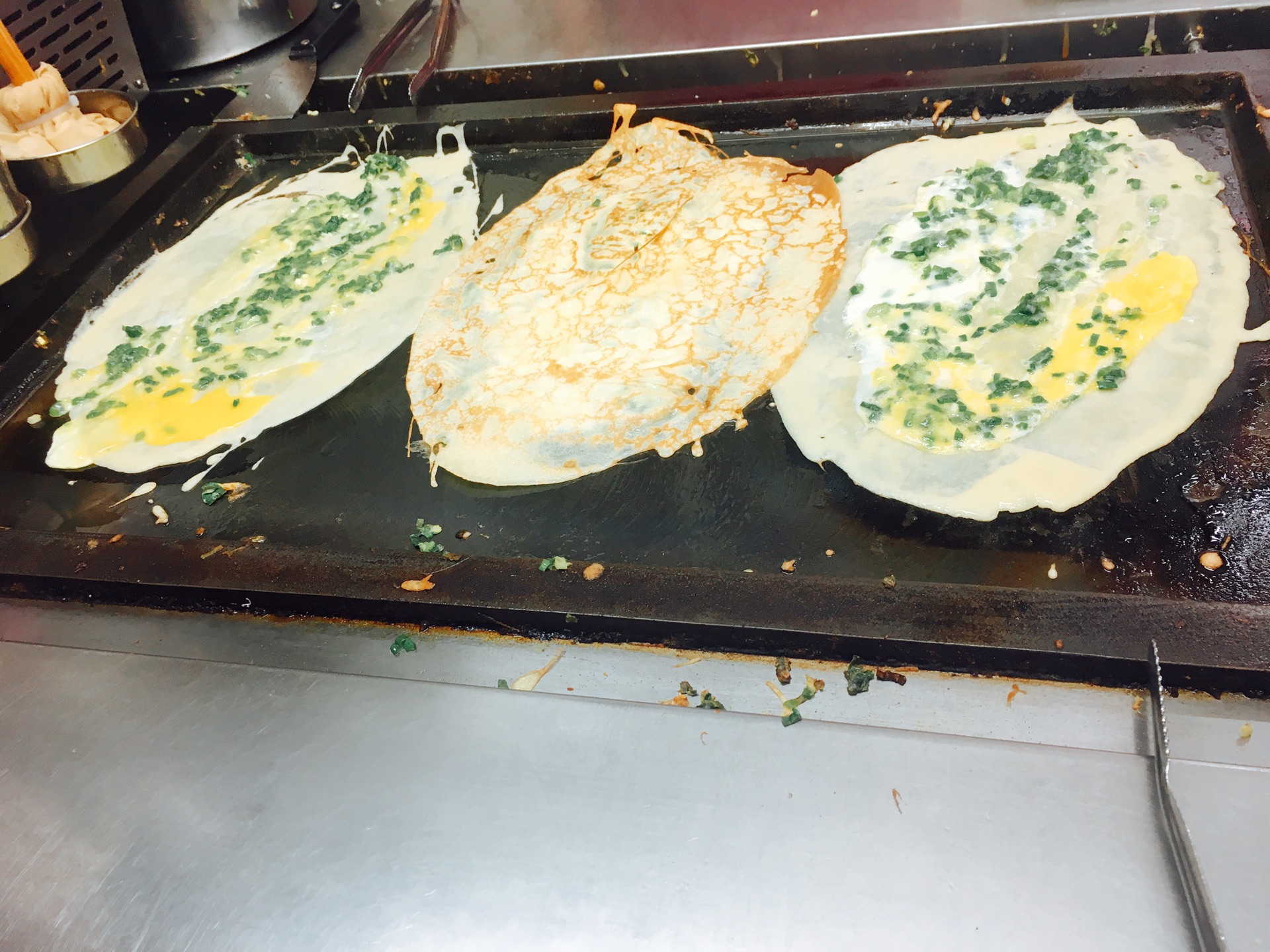 另一家人气超高的明伦蛋饼已经需要叫号了,观摩了下制作过程,其实就是鸡蛋饼,好吃是好吃的,但是绝对比不上加了脆皮和油条的山东煎饼。