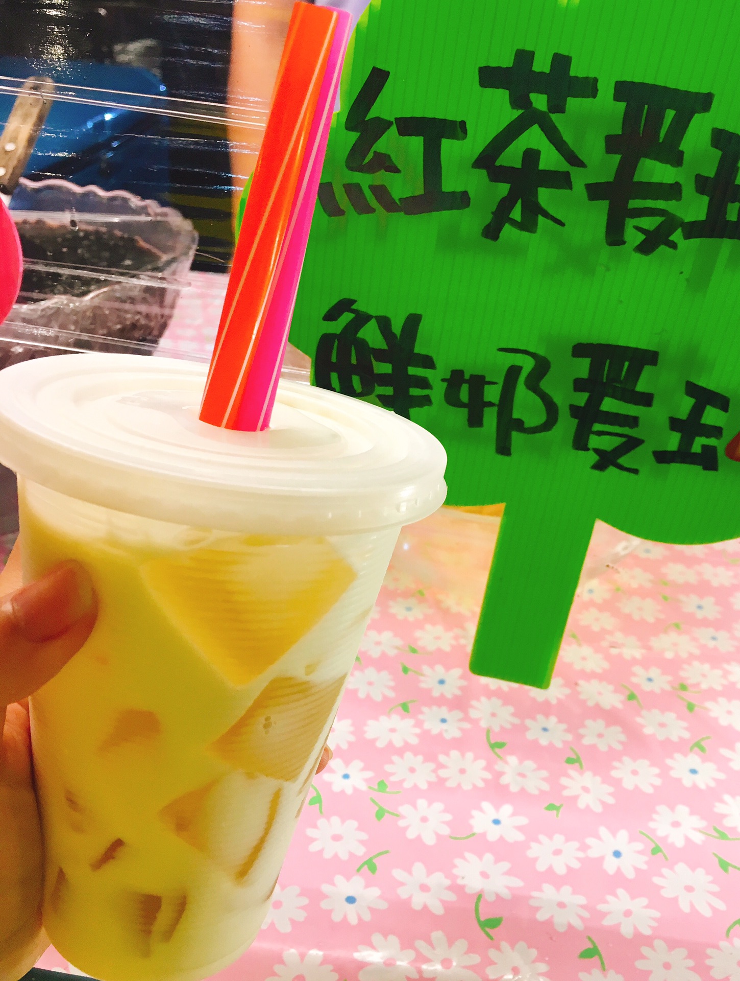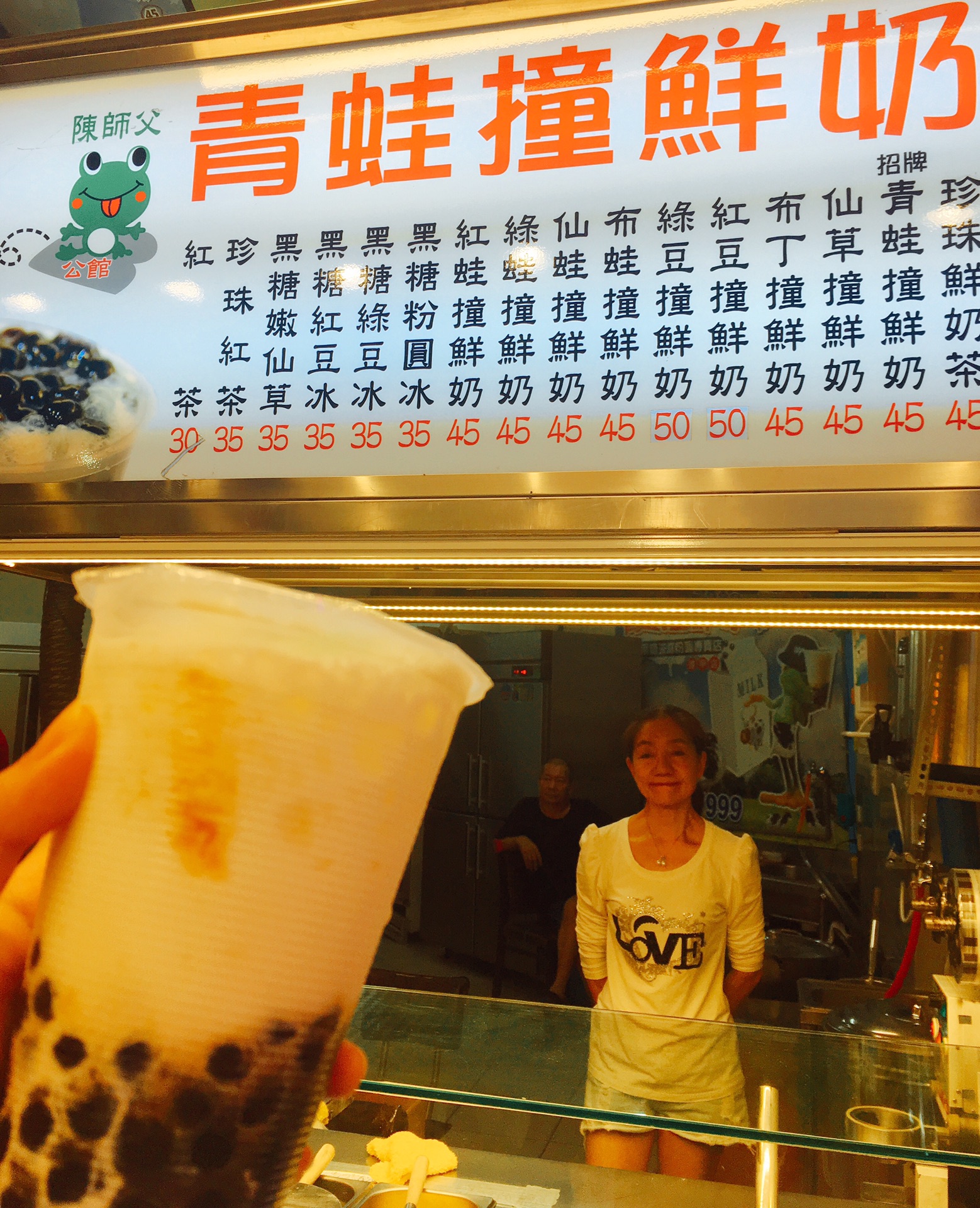 夜市最不缺的就是各类奶茶、冰沙和鲜榨果汁了,先点一杯青蛙撞奶和芒果绵绵冰解腻。