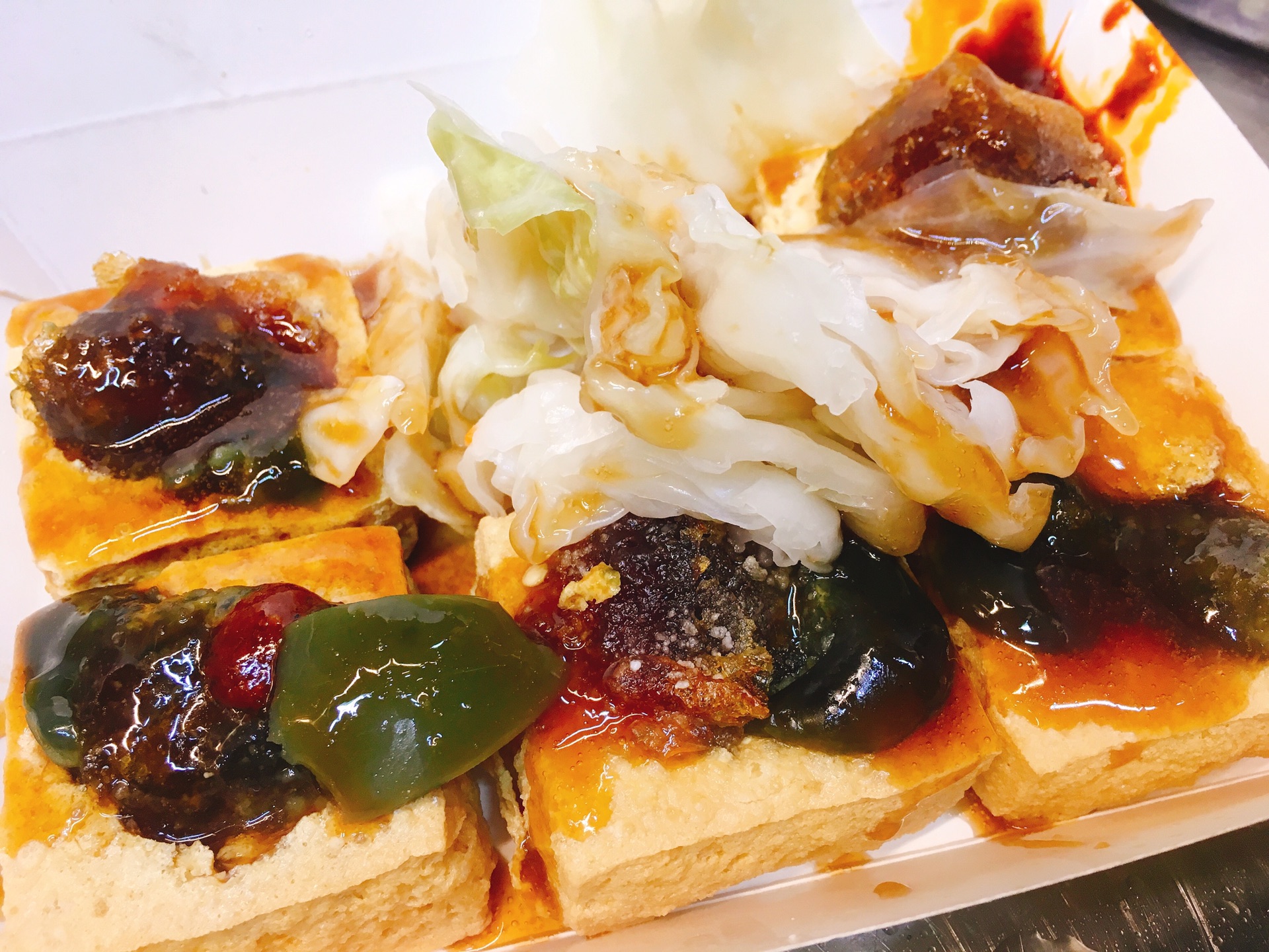 皮蛋臭豆腐真的好好吃,将油炸好的皮蛋嵌入香酥的豆腐里,淋上秘制汤汁,再配一点酸甜爽口的白菜,满足得不要不要的。